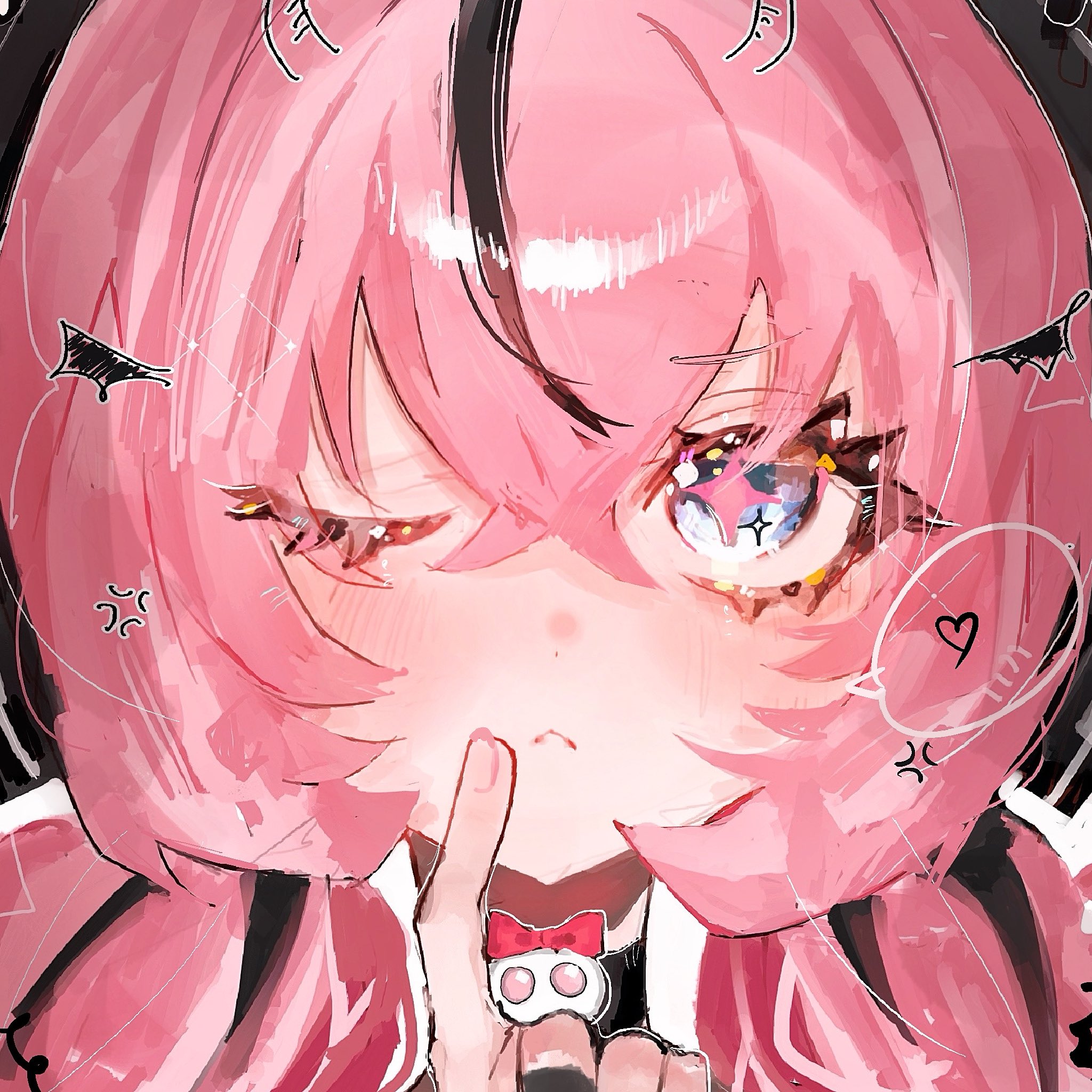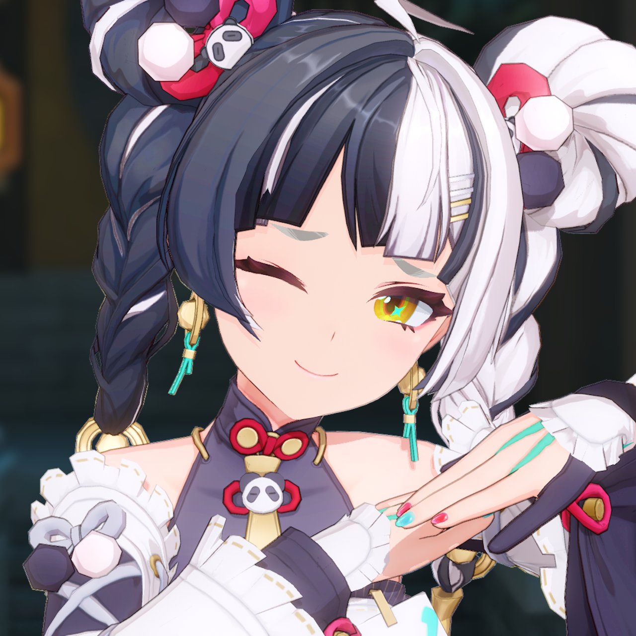 >>563479236it's pink with blue and yellow glitter. the base of her eyelashes also have white glitter. i love the 3rd person camera mode since you can get a close up of small details