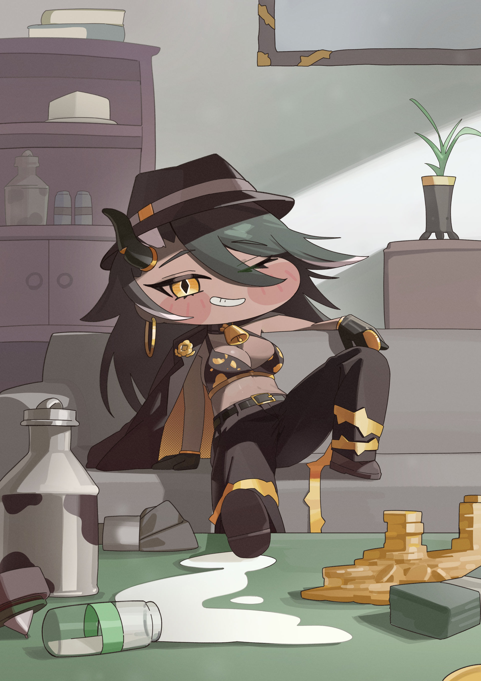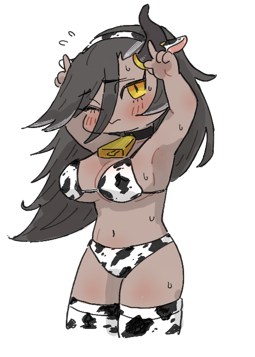 >girl with huge tits in a cowprint bikini and a collar with a bell, dealing in illegal milk distribution