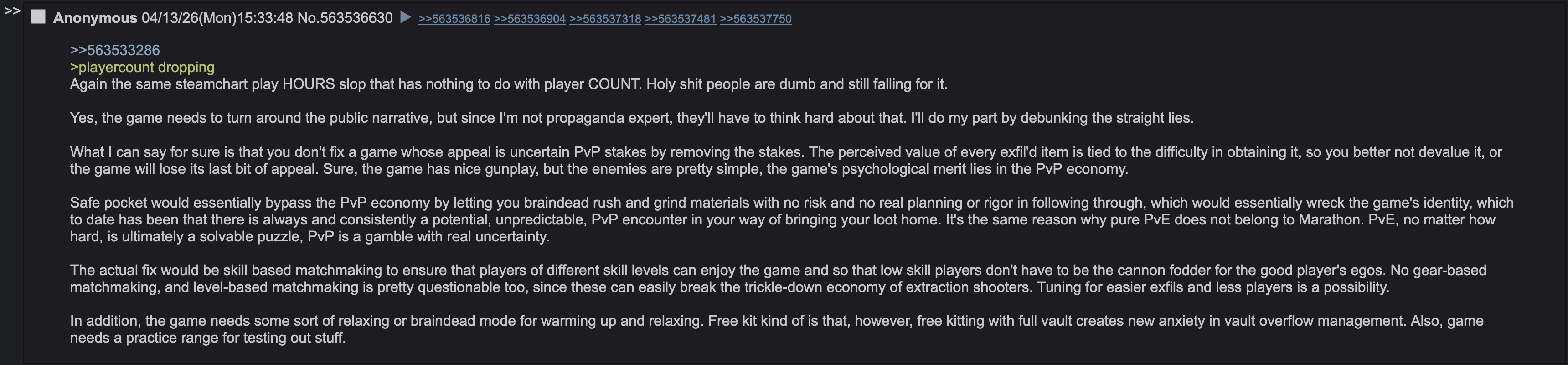 >>563507009Bungie probably invested some of their own money before Sony bought them and said>Battle Royales are so played out, but with extraction shooters we have a golden opportunity to get in on a new ground floor! without realizing that BRs are mostly popular because of the "fresh start" rule applied to everyone, and because the presence of bot lobbies and heavy SBMM makes it so the average toddler or dad gamer feels good enough about their gaming abilities to drop more cash on MTX. Extraction shooters are something that cannot take off unless you make them as friendly as *** *******, to where its more likely that random solos or duo players can team up to succeed instead of kill each other. The other problem is that Marathon's fanbases are at odds with each other; you have the casual players that just want to complete contracts and fill out their Codex/lore entries because they absolutely love the setting, and then you have the PvP fags that just want to camp and kill other players. Probably not even because they want to steal their loot, but because they love to play the game like a Battle Royale.