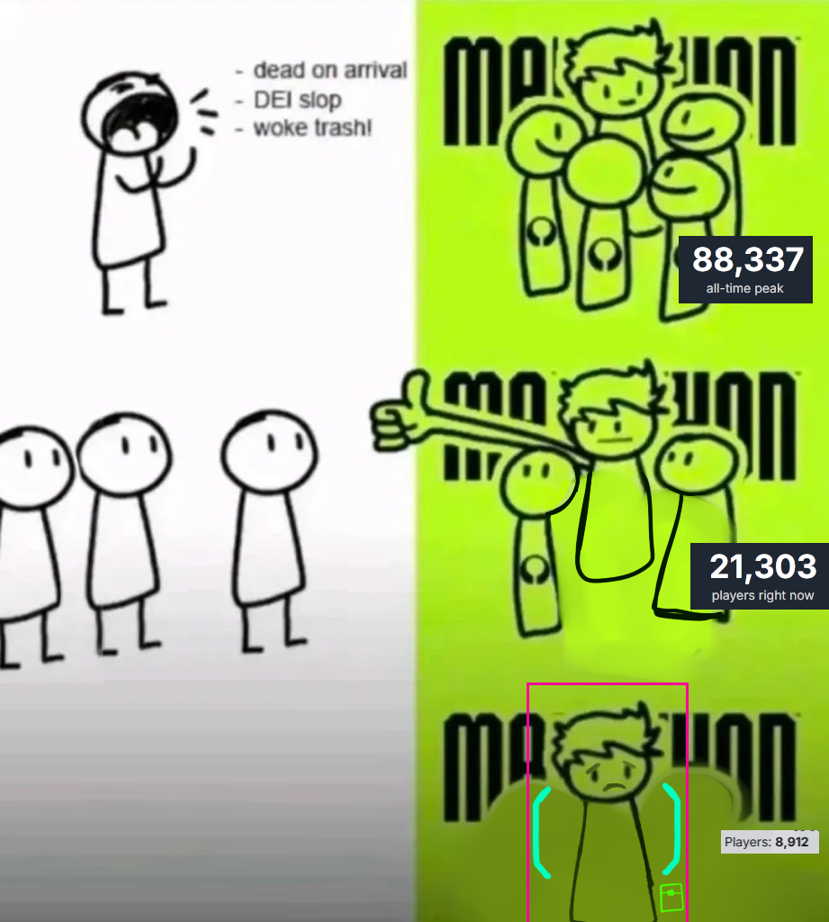 >>563530786for Marathon to have had a successful launch it would have had to have launched with a like 300k+ player peak. There's no possible way for Marathon to rebound and achieve something resembling a healthy audience number because Bungie as a company is totally unsustainable.
