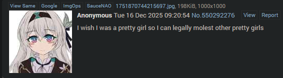 >>563537563ew imagine the smellno wonder ur virgo>>563537645I know it's hard for a foid to understand but penises are not like that, Yuria