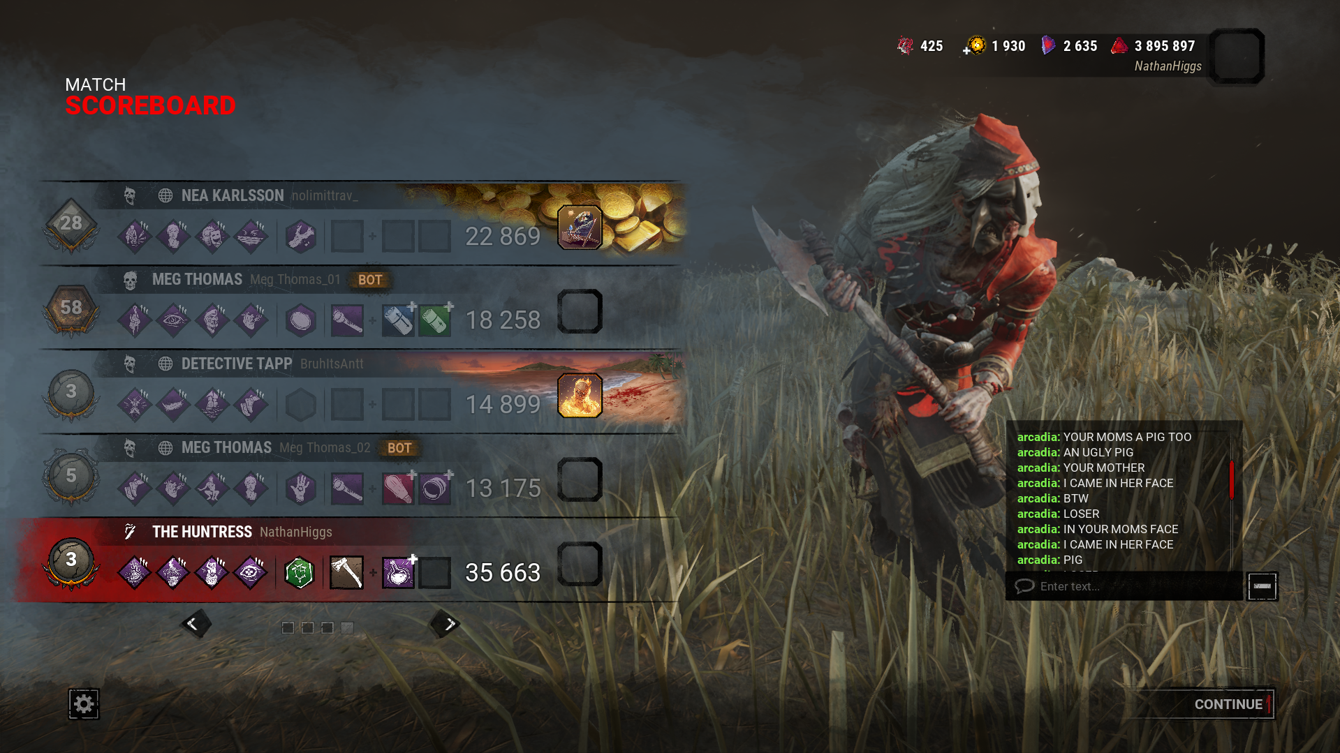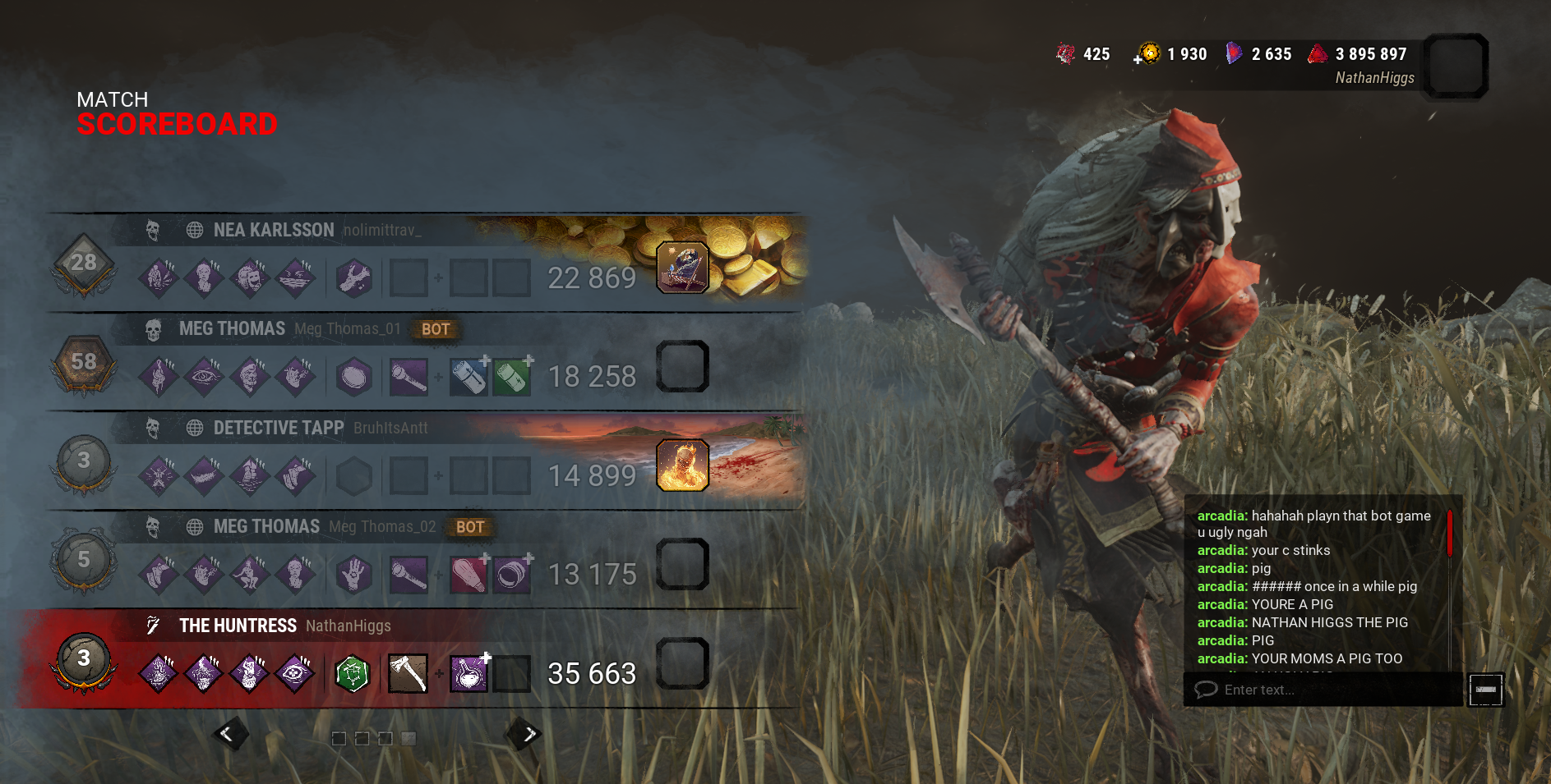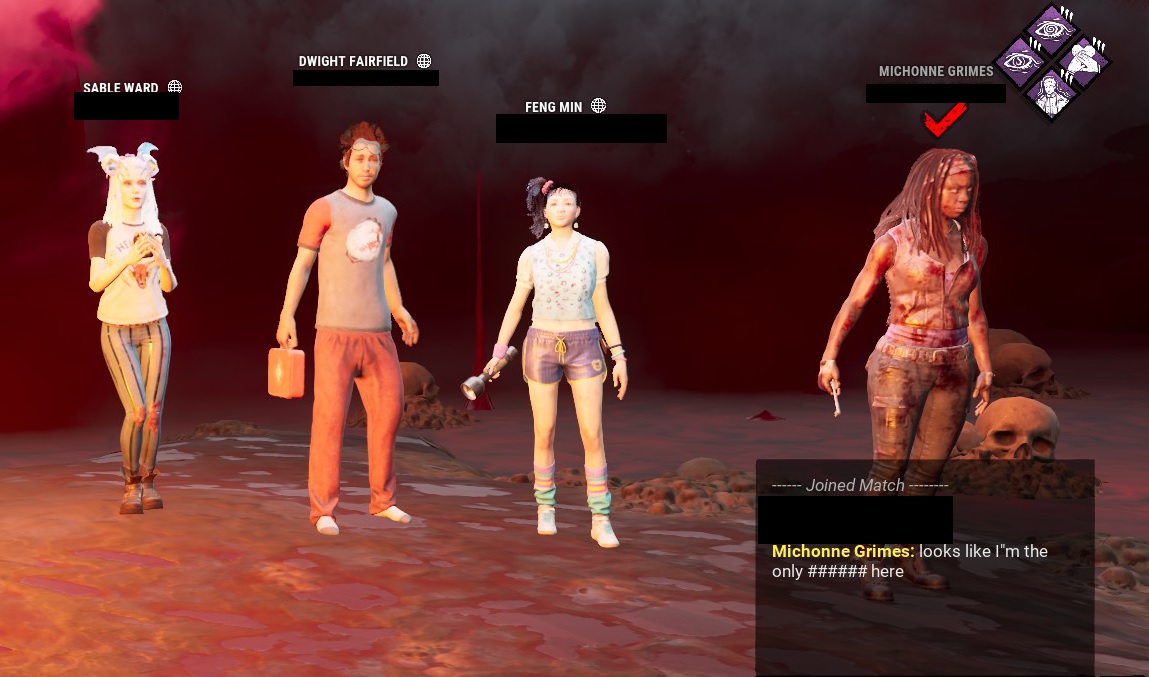 This game is an obnoxious sweatfest that’s barely fun and the survivors are all egomaniacs who feel the need to gloat over beating fucking Pig. Can somebody just fucking firebomb BHVR’s office so this game can die and free us already?