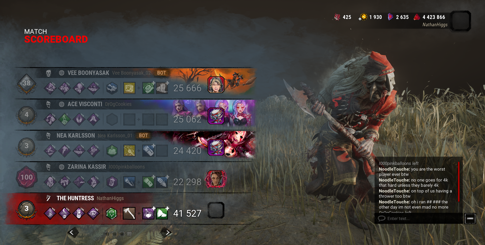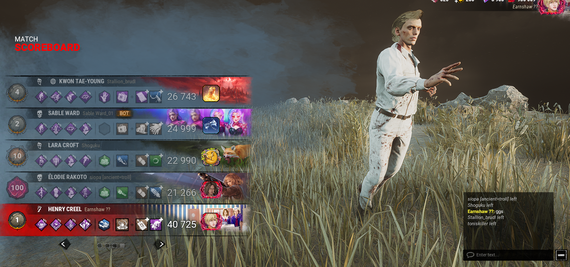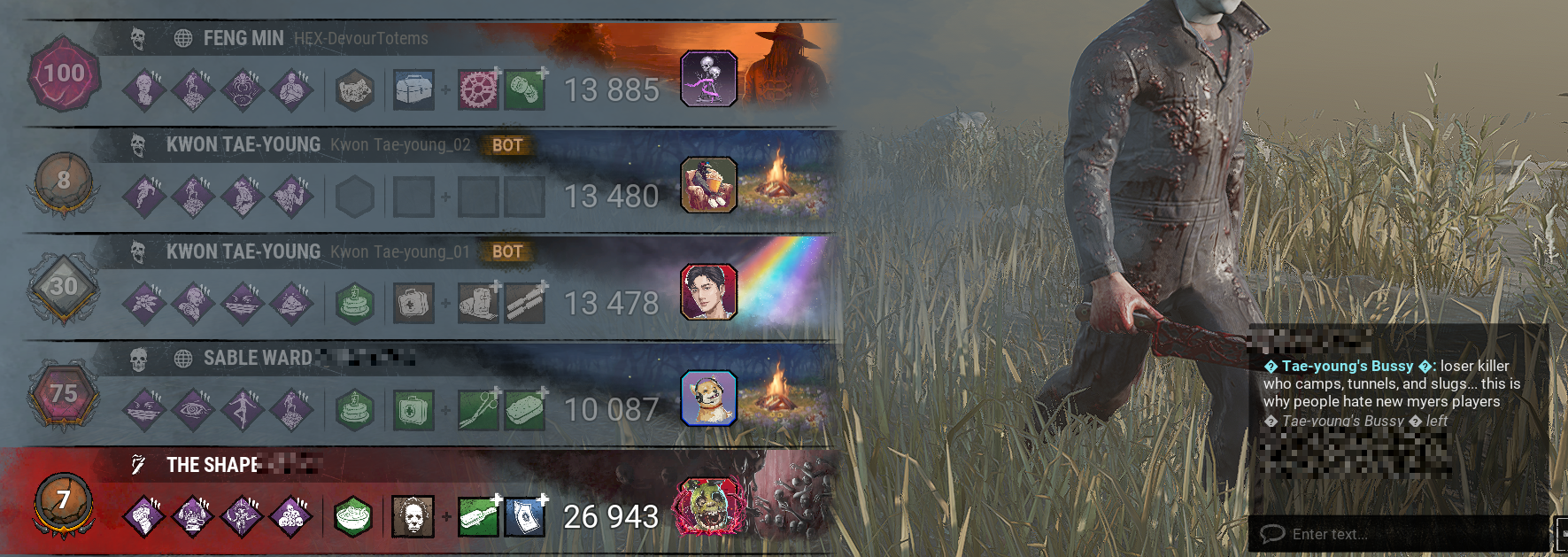 >>563547267brotherman I'm a survivor main but don't dare to post survivor postgames because this thread is for killerchuds only