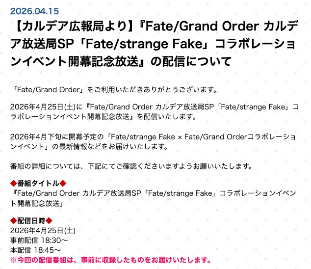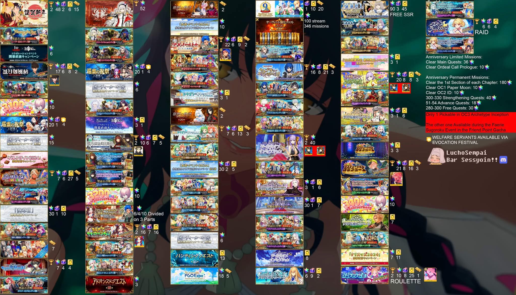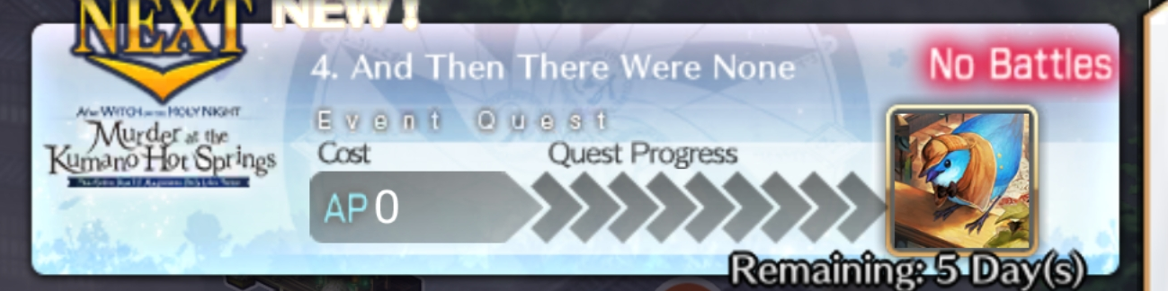 Previous: >>563429714> [Event] Witch on the Holy Night × Fate/Grand Order Collaboration Event "After Witch on the Holy Night/Murder at the Kumano Hot Springs - The Robin Saw It! Magicians Only Live Twice"https://webview.fate-go.us/2026/0324_witch_night/2026-03-30 01:00 - 04-19 20:59 PDT>[Summon] Witch on the Holy Night Collaboration Event Aozaki Aoko Pickup Summonhttps://webview.fate-go.us/2026/0329_witch_night_pu1/2026-03-30 01:00 - 04-19 20:59 PDT>[Summon] Kuonji Alice Pickup Summonhttps://webview.fate-go.us/2026/0403_witch_night_pu3/2026-04-03 21:00 - 04-19 20:59 PDT>[Summon] Space Ishtar Pickup Summonhttps://webview.fate-go.us/2026/0331_witch_night_pu2/2026-03-31 21:00 - 04-19 20:59 PDT>[Summon] Free Quest Backup Amor (Caren) Pickup Summonhttps://webview.fate-go.us/2026/0405_witch_night_qbpu/2026-04-05 21:00 - 04-19 20:59 PDT>[Summon] Pickup 4 Summonhttps://webview.fate-go.us/2026/0405_witch_night_pu4/2026-04-05 21:00 - 04-18 20:59 PDT>[Campaign] Spring 2026 New Master Support Campaignhttps://webview.fate-go.us/2026/0319_new_mst_cp/2026-03-22 21:00 - 04-24 20:59 PDT>[News]https://webview.fate-go.us/>[Servant Info]Servant Material Lookup: https://fgosim.github.io/Material/Servant Planner: https://github.com/chaldea-center/chaldeaCoin Calculator: https://fgo-servant-coins.glitch.me/index.htmlRank Up + Interlude Timeline: https://kazemai.github.io/fgo-vz/relate_quest.htmlRate Up Tracker: https://tohnocoding.github.io/fgobanners/>[Mats/Summoning Info]Rateups in FGO JP: https://files.catbox.moe/lf1qmz.pngQuartz for next Summer: https://docs.google.com/spreadsheets/d/1iRH60QpLNvHy9MMDKLJGNSg4s7FsDfdXtJtOUVDj5po/edit?gid=162156045#gid=162156045Drop Rates: https://docs.google.com/spreadsheets/d/1_SlTjrVRTgHgfS7sRqx4CeJMqlz687HdSlYqiW-JvQAFGO Raw Database: https://apps.atlasacademy.io/>[FAQ]https://rentry.org/alter-faq