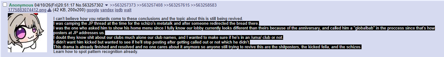 >>563560445Totopo got kicked for trying to stir up JP threads but I think that was a witch hunt. There were posts when he started posting where he asked if it was ok for him to post there because the /uma/ thread was being spammed (gay shit or scat), and he got told yes by actual JP players seemingly.He was doing full career runs and posting like 2 screenshots from each of them, sometimes with questions. It did go on for like 6 hours but that was only like 10 posts total across 6 hours, and with his fan gains he obviously played more than 6 hours every day anyway. I would unironically believe he was trying to escape the literal shit being posted in /uma/ at the time like he claimed in the JP threads before I believed he was trying to troll them.