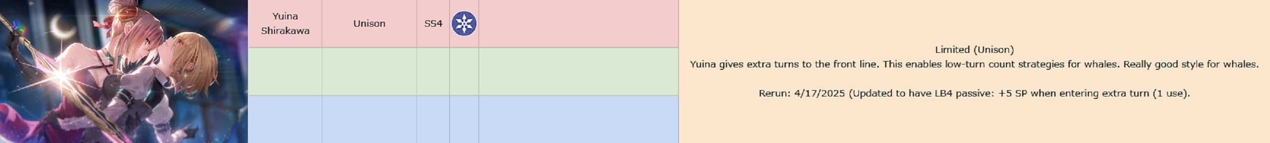 >>563602874I often forget it myself and recommend the wrong resonance. We're still missing good resonance for Light too, their options for abilities are still only Chie SS4 for Morale or Ichigo SS3 for Defense buff. Fortunately Yuina SS1 is also light so you can LB4 her and then stick her on her SS5 for that double dipThe light admiral is next so hopefully that'll incentivize them to add some light resonance buffs.
