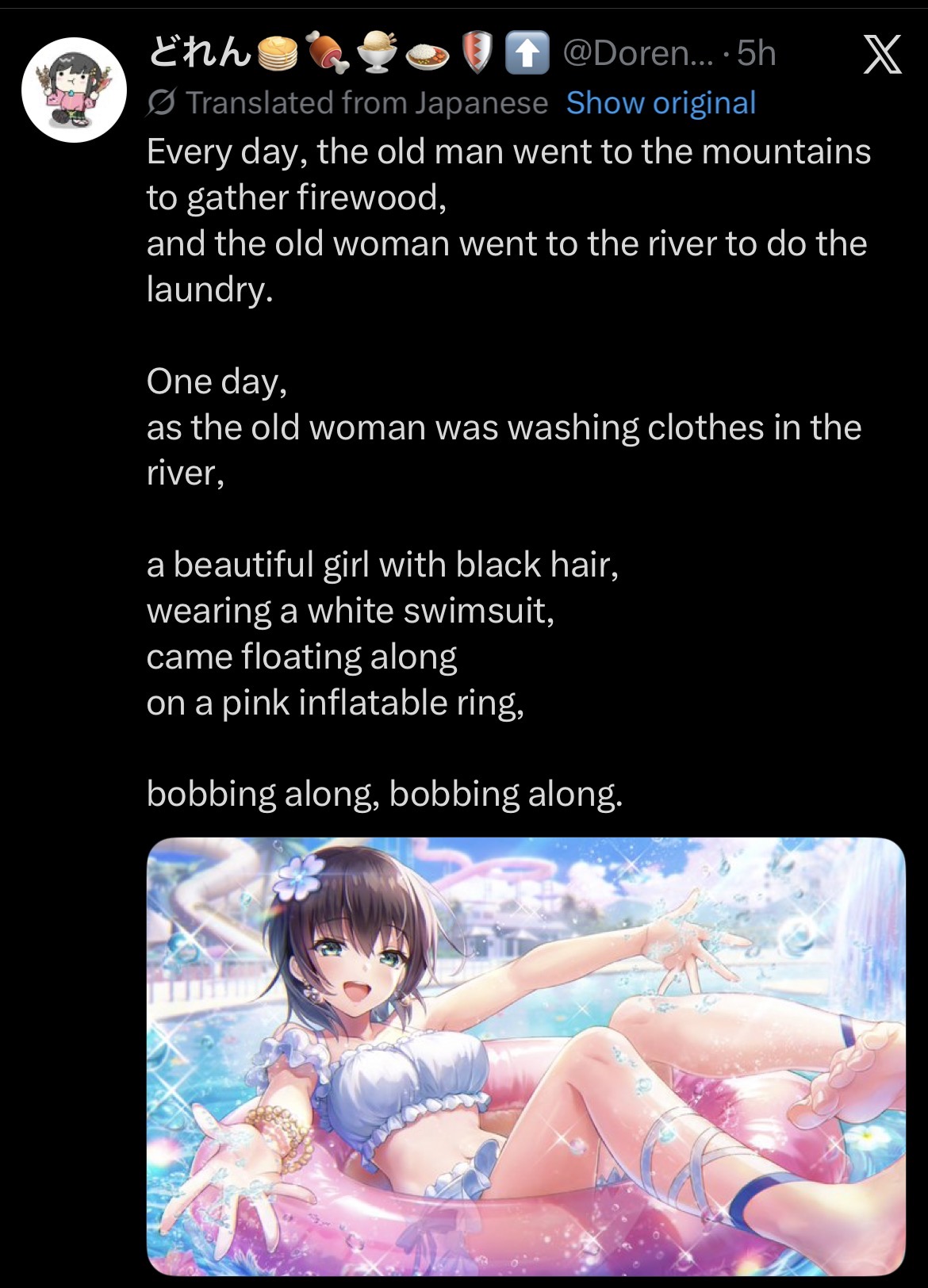 >>564124429And then,she was gone.But the old woman told the old man,and the old man told the townsfolk,and the townsfolk told of her forever.And ever, and ever, and ever, and ever, and ever.