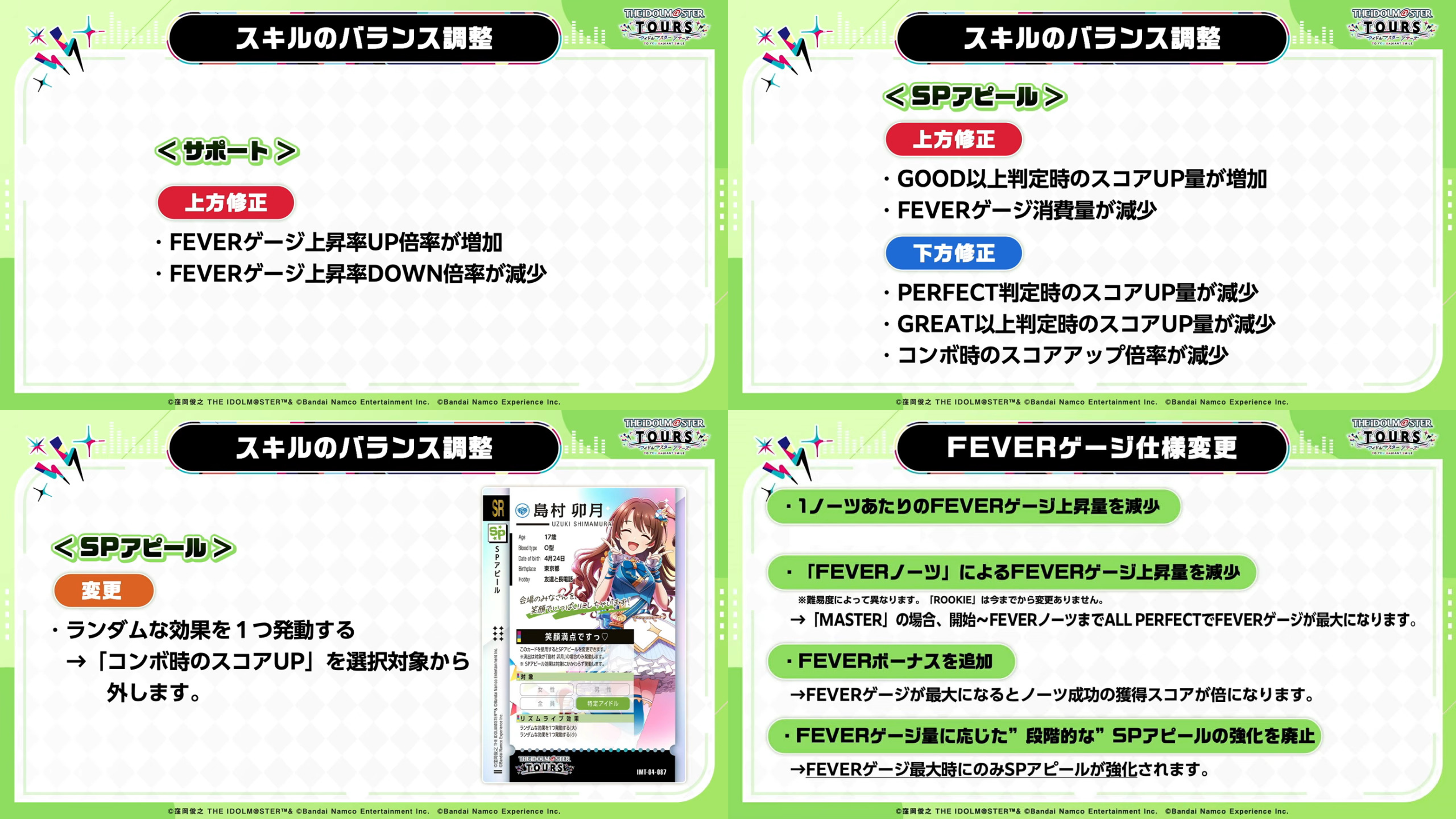 Upcoming balance changes:>support effect adjustments>SP appeal adjustments>random effect Uzuki will no longer roll the combo bonus (thank god)>slower fever gauge gain>2× note score multiplier when at max fever gauge>fever gauge bonus on SP effects will now only proc at max gauge