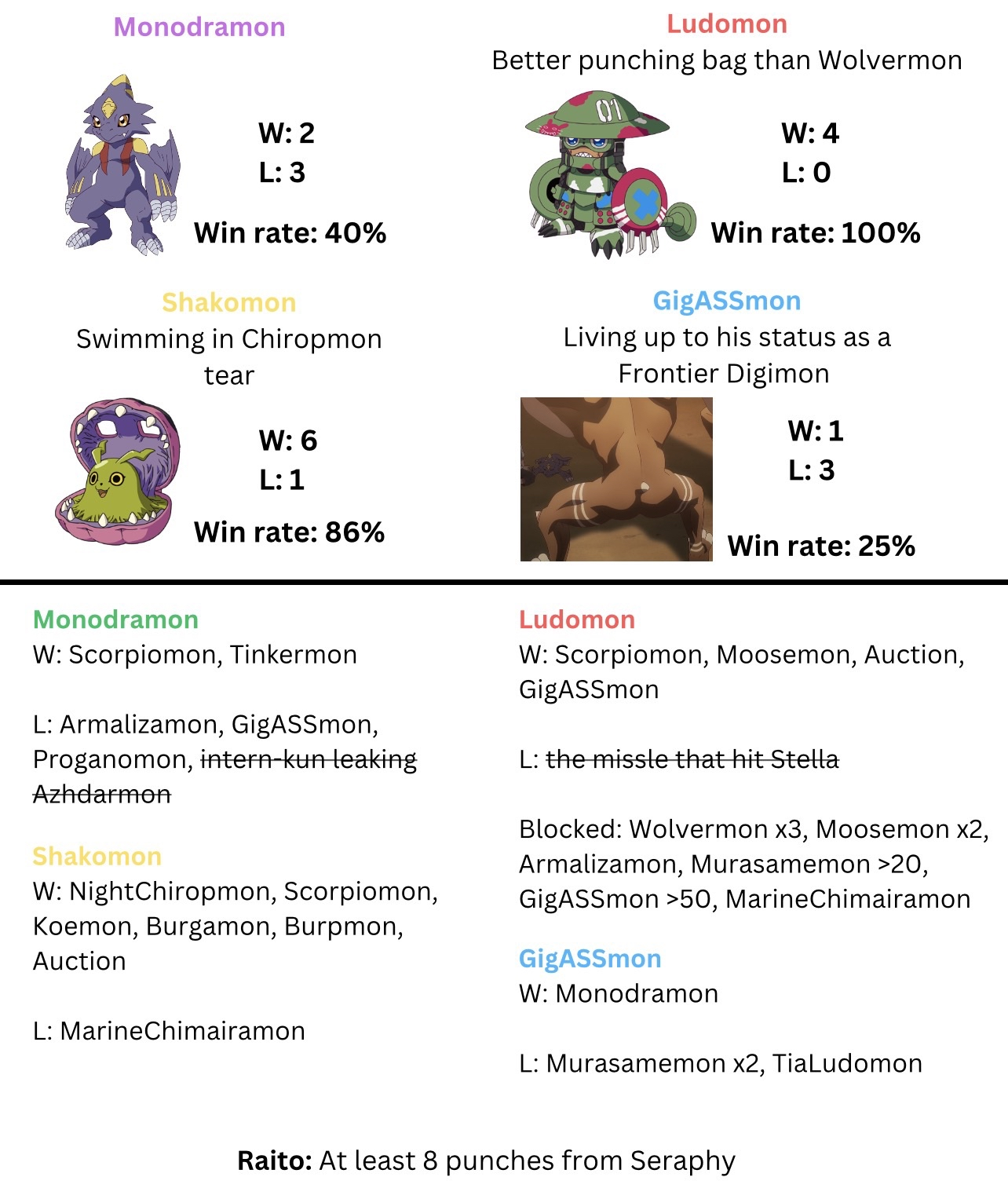 >>563863547gigasmon has a win against ludomon though, he was beaten to the point he lost his armor. his loss against tialudomon should be separate.