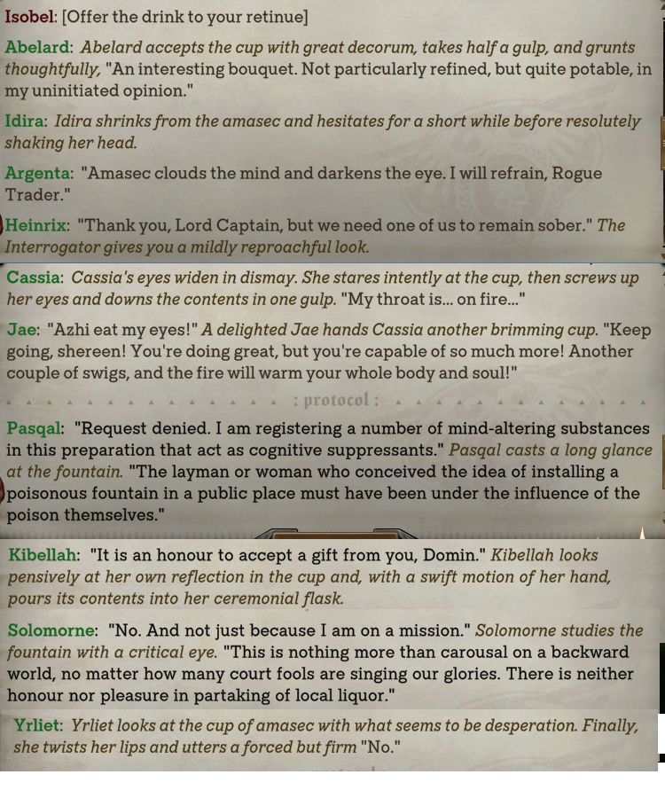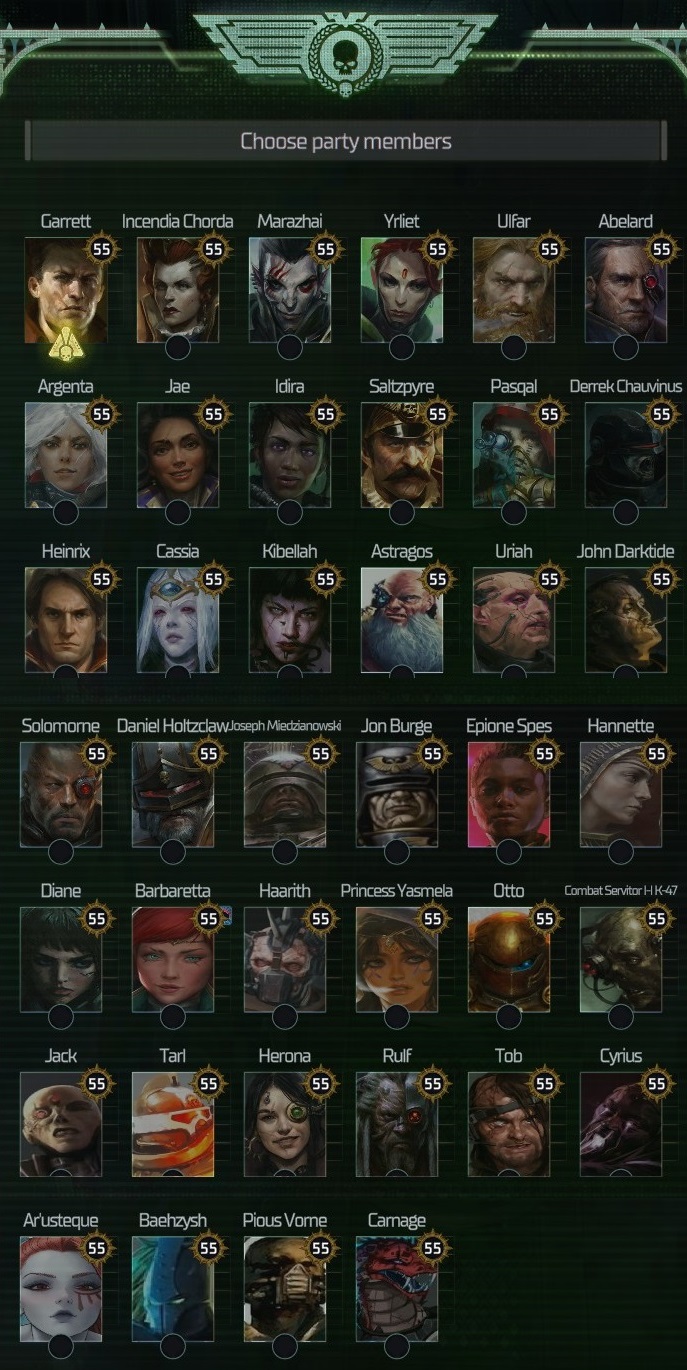 >>563615148This was my opportunistic crime lord retinue by the end of the game.I had multiple thematic teams like Arbites, Criminals and Cold Traders, Religious zealots, Admech team, Mercenaries and Death Worlders, Heinrix invited his Inquisition friends and eventually Nocturne brought my Shriekers so I made Deldar gfs and a Sslyth since I learned how to further customize characters with a toybox.>>563615837yes, take her with you in act 3 alongside ArgentaHer quest pretty much happens alongside main quest in act 4 anyway