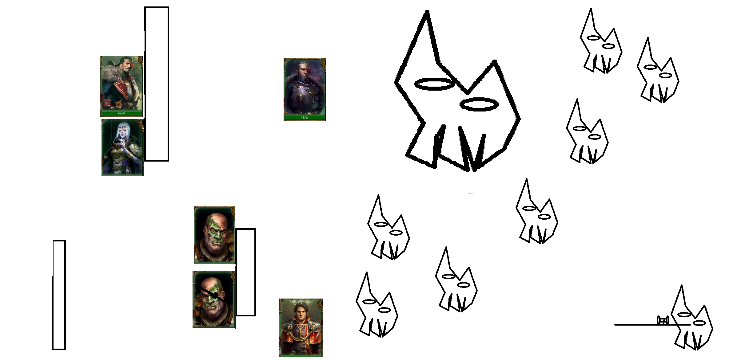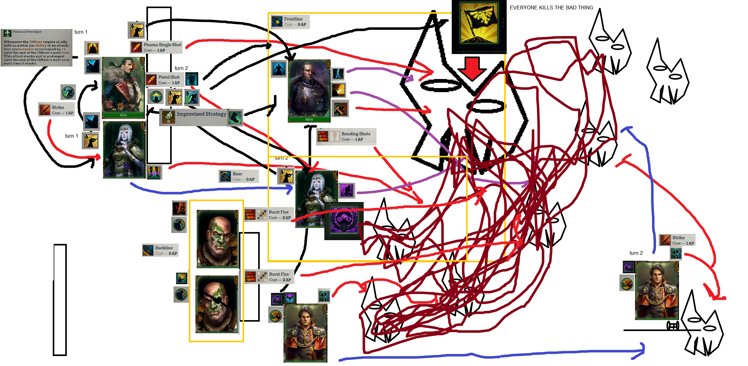 >>563620597hm actually I need to swap stronghold stratagem with voice of command on cassia turn order there or I don't get the voice of authority perk on her>>563620642obviously she needs to start in the back so that the sniper doesnt get her before heinrix deals with him, RETARD