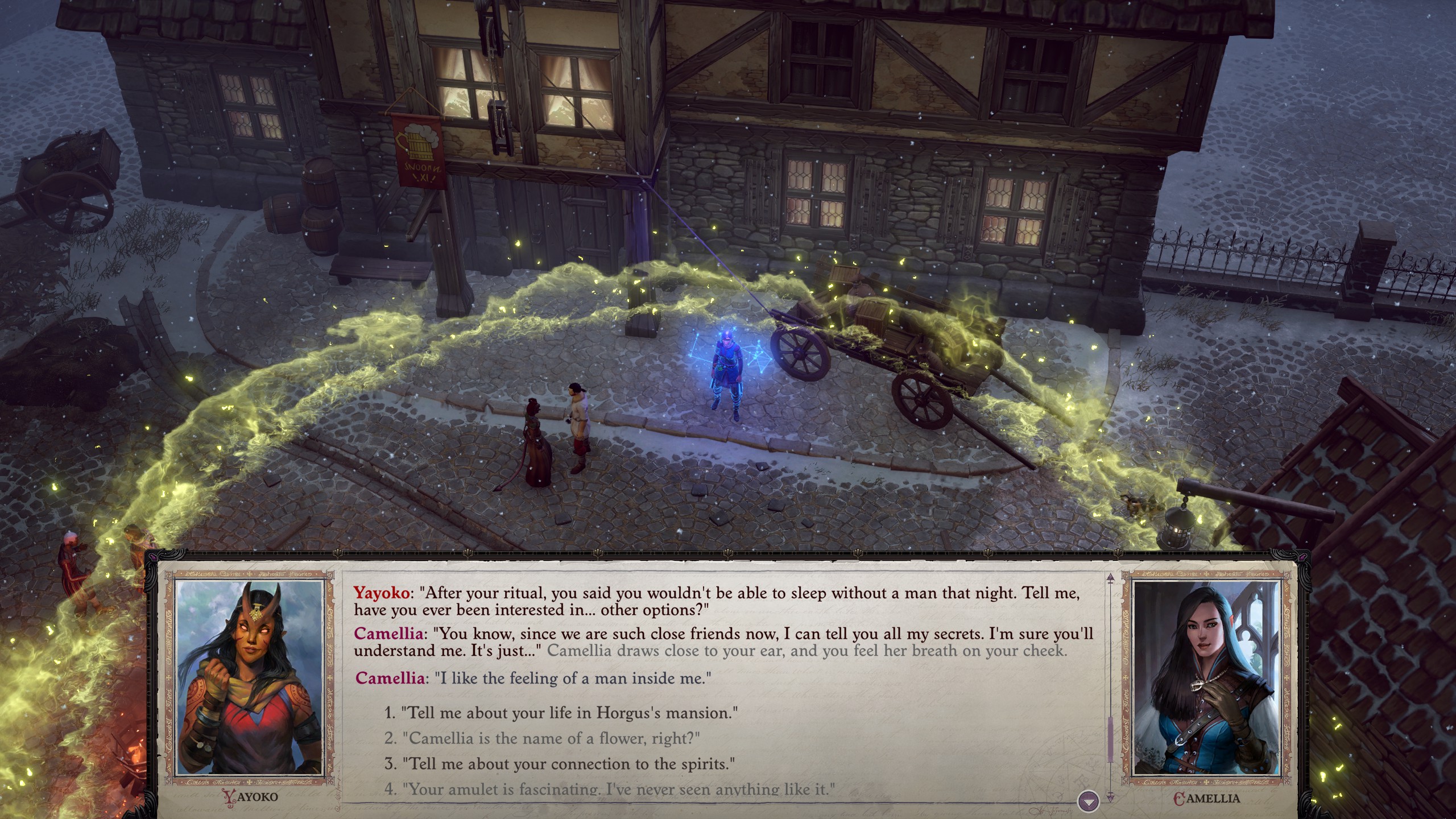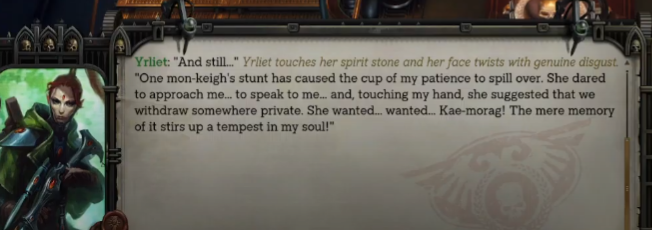 >>563662054Cassia is a sheltered scion of a noble house, who's probably expected to marry some two-headed cousin eventually to keep the Navigator bloodline pure. She hasn't previously interacted with anyone who wasn't either close family or a serf, but she's read romance novels, and starts awkwardly pursuing an illicit courtship if you're nice to her.Kibellah is an edgy goth girl. She reads Tarot cards, cuts herself in her idle animation and calls you master. She's in a cult, but not, like, a BAD cult. She's a mysterious creature of the night, and would probably rather be playing Vampire: The Masquerade instead. It's not cringe though, since she's hot.Yrliet talks shit nonstop, and reacts violently to any insinuation that a space elf might have sexual relations with a lesser being like a human. If you play along, you can eventually hold hands and mediate together. I like her party banter, but I wouldn't consider it a romance.Jaethal is a shameless gold-digging harlot and probably a gypsy as well.Solomorne isn't really a waifu since he's a man, but I'm bringing him up anyway since during his quest, you get like ten different chances to flirt with him. Basically every dialogue choice on that ship has an option to start making moves. It's bizarre. He won't start grabbing your ass unless you do it first, though, so just read the lines carefully when you're talking to him.