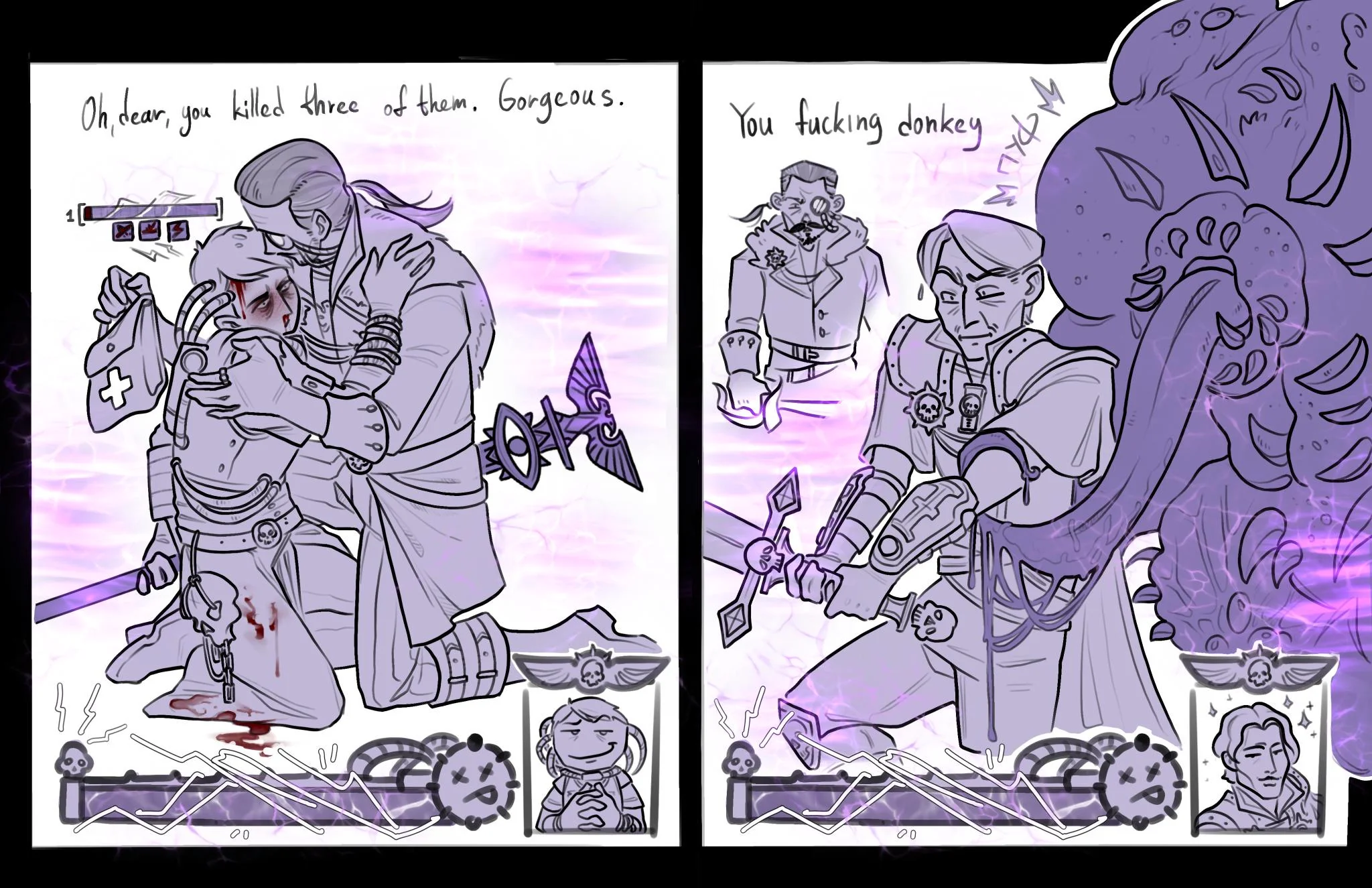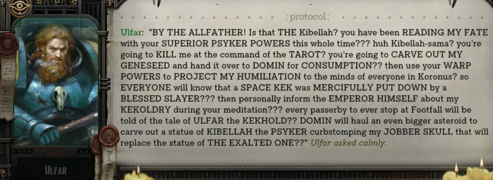 >>563616381Idira understand where she stands. Without Theodora, there is no way she could accuse a respected and beautiful Sororita and live. Especially considering that the sister had just helped to repel a chaotic revolt, and likely became a left-hand woman for the new RT. She's an unstable psyker and knows that. She likely divined ages ago but knew she couldn't do better until Argenta confessed herself.>>563616810Yup. He could've given her respite from the voices, yet she explicitly chooses you out of loyalty - and possibly even sexual attraction.>>563617021That could be false confession inspired by guiltAnd even if it wasn't, she never ever does that again, despite continuing to drink - or give in to the demands of daemon wearing Theodora's face. It would've been so easy to give in and attack you alongside the demon (which btw effortlessly possessed nearby crew members).Idira is smart, loyal and strong-willed.