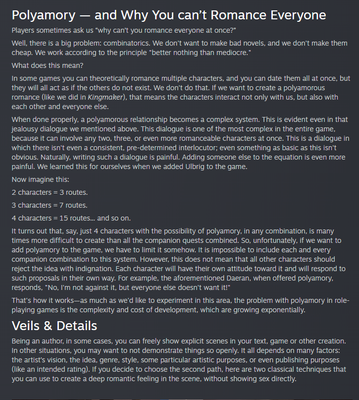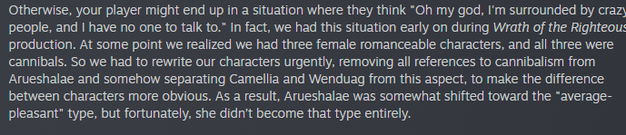 >>563673904>At some point we realized we had three female romanceable characters, and all three were cannibals....so we left it like that!Because I have no fucking idea what do they mean "so we had to rewrite", all three of them are still cannibals in the finished game. You still get told Arueshalae used to eat people, Camellia still eats chunks of people in front of you, Wenduag still ate that aasimar.