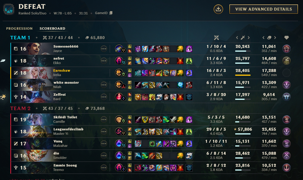 >>563667730that was 1 game where i won due to my skill, nothing else...>>563667817played 4 games 50% winrate with the 1st game being impossible to win due two players on my team haven't played since last year and even then riot recognized i don't below in d1 so they upped my mmr to 1K lp gaining +30 a game but go off lol... you do realize with +30 lp i'd have to maintain below 33% winrate for 80 games or so to drop rank right...? you think i can't hit masters again...? lol...?