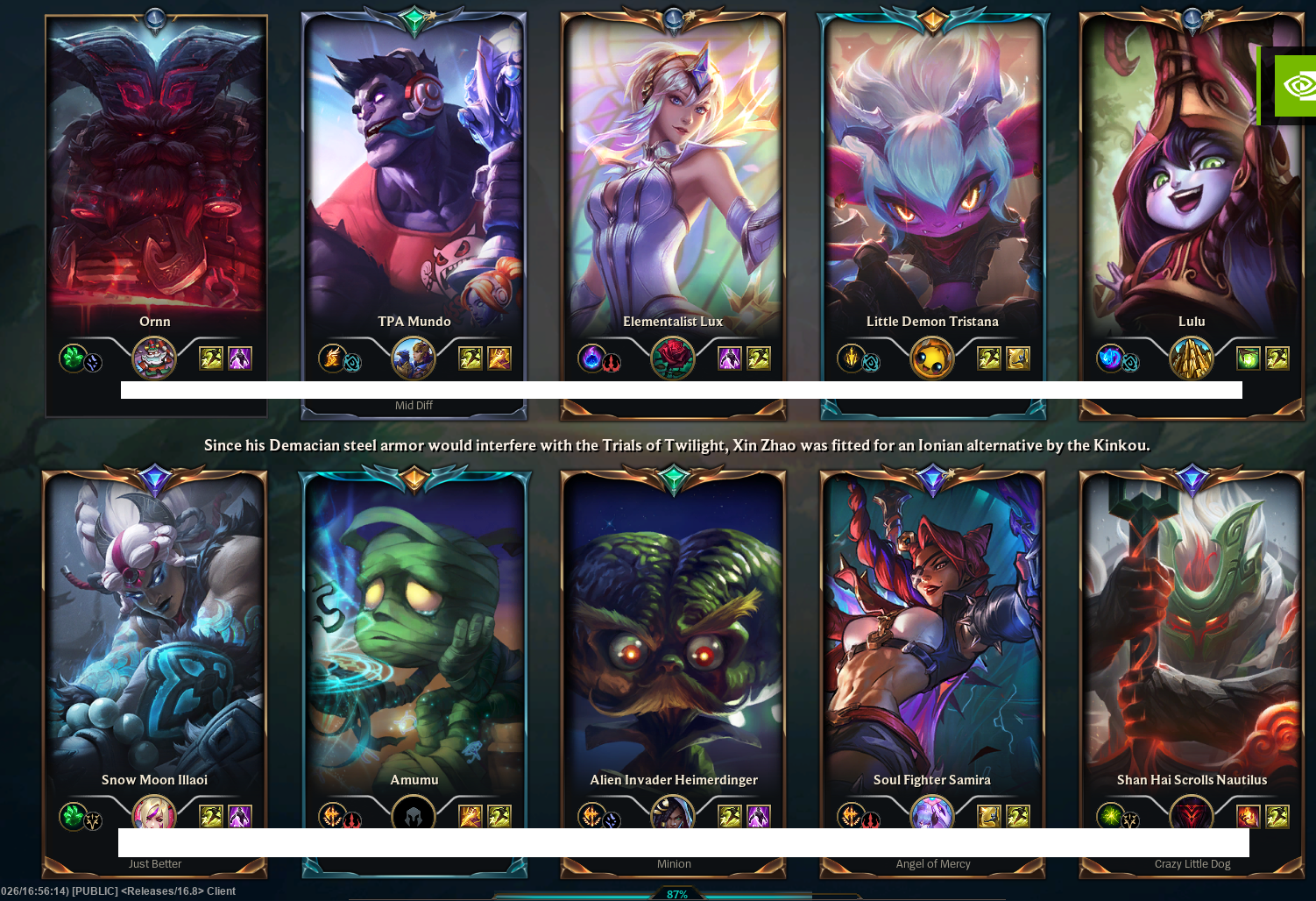Previous: >>563510210 >Official Wiki, Patch Notes and PBEhttps://wiki.leagueoflegends.com/en-us/ >Builds/Account Statshttps://u.gg/https://www.op.gg/https://lolalytics.com/ >Model Viewerhttps://www.modelviewer.lol /lolg/ OP pastebinhttps://pastebin.com/8xZvBfnZ