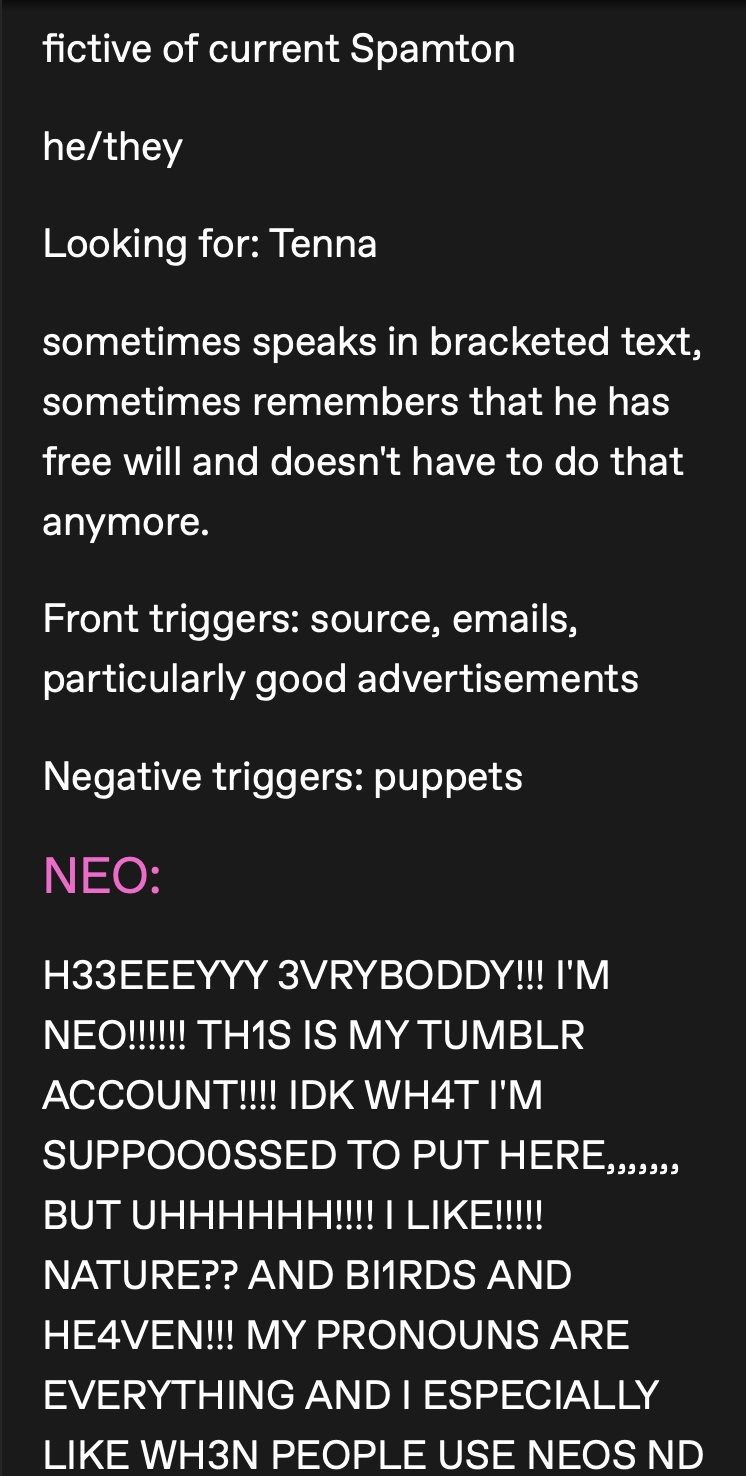 >>563639636Even outside of here, most pointers indicate that the spamtennafags have actually played the game as evidence by the time they shat on the artist I mentioned for NOT having played the game, I remember when the new chapters first released they used to make charts and shit where they collected evidence of spamtenna having happened with dialogue screenshots and all the same way an autist would present their schizotheory in image formatI'm not saying it can't happen, there are definitely fujo secondaries, but my main point is that the secondaries have been shown to be the outliers so far