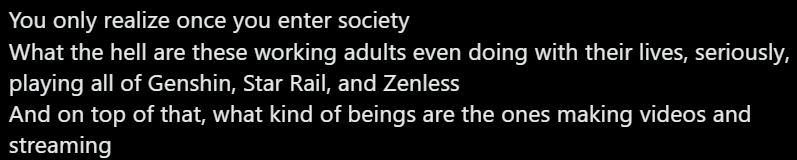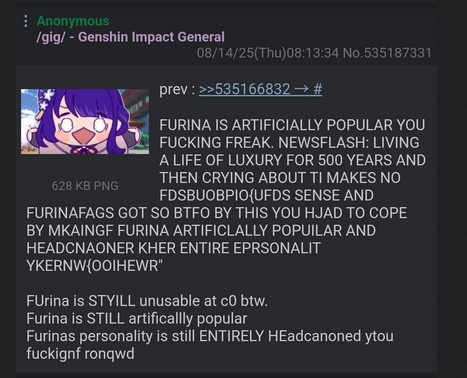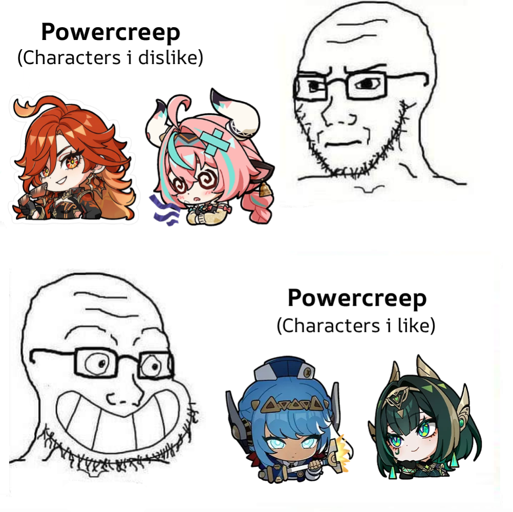I will never understand how metafags find it so enjoyable to drain out all fun from literally anything they touch, from RPGs like Baldurs gate to shooters to even platformers like super mario.What happened to the concept of trying out weird but fun combos? No wonder devs stopped trying to let players get creative when 90% of the sheeple will just follow a single build or whatever.Meanwhile i'm having a lot of fun exploring the new region with my scuffy Linnea at lvl 70, Mavuika, Zhongli and (mostly) healer Furina. Somehow i haven't had any trouble progressing the story line so far either, despite metafags making it sound like i literally can't beat a hilichurl unless i use their 0.1% builds, and that means i'm not having FUN...