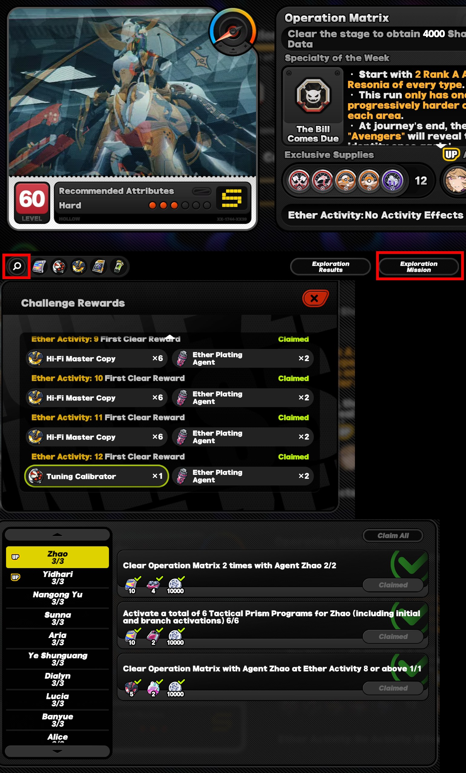 >>563632160Alright bwo making me log in ot get a screenshot just cause I like helping new people out. Anyway the one ont he left shows your rewards for clearing at every difficulty level. After you hit 12 once you're done and no longer have to do it.The other button is the agents that will give you additional rewards if you clear with them in the team. Every agent in that list has a 1 time only reward for clearing at level 8, but none for level 12. Basically: Build up to a single level 12 clear, then run level 8's with the agents in that list, and then you can do level 0's for the rest of your life. Or until new agents get added to the list, which they seem to be doing every update since I think Cissia will be there tomorrow. The agents with UP on the operation matrix screen will get you bonus points This week is Zhao, Yidhari, and auxiliary Manato if you use them in the party, so you can do a single run with them to get all your points in 1 go. You can also do multiple runs to make sure you cap out on Z-Merits since they're useful.