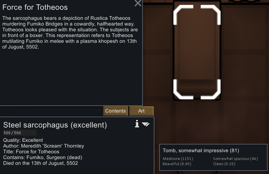 >>563674770>>563674815I'll hold the funeral in what was once her room, then transfer her body to a proper cryptocoffin once I have them researched. Funnily enough the person in charge of building her sarcophagus decided to immortalize her jobbing to the Empire.On the bright side I was able to grab the plasma sword and a set of recon armor from the surviving member of the raid. Not sure what I'll do with the prisoner yet.