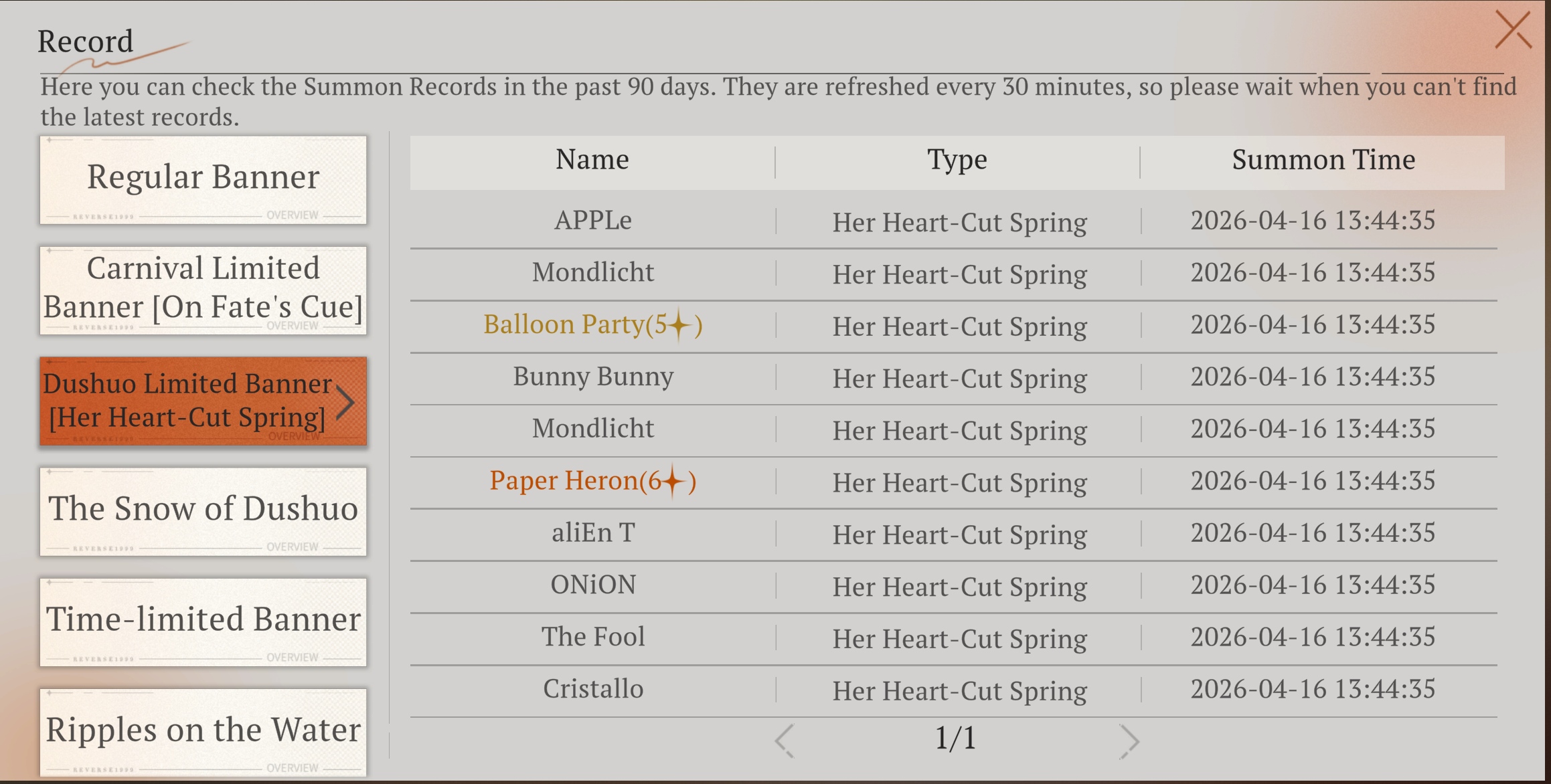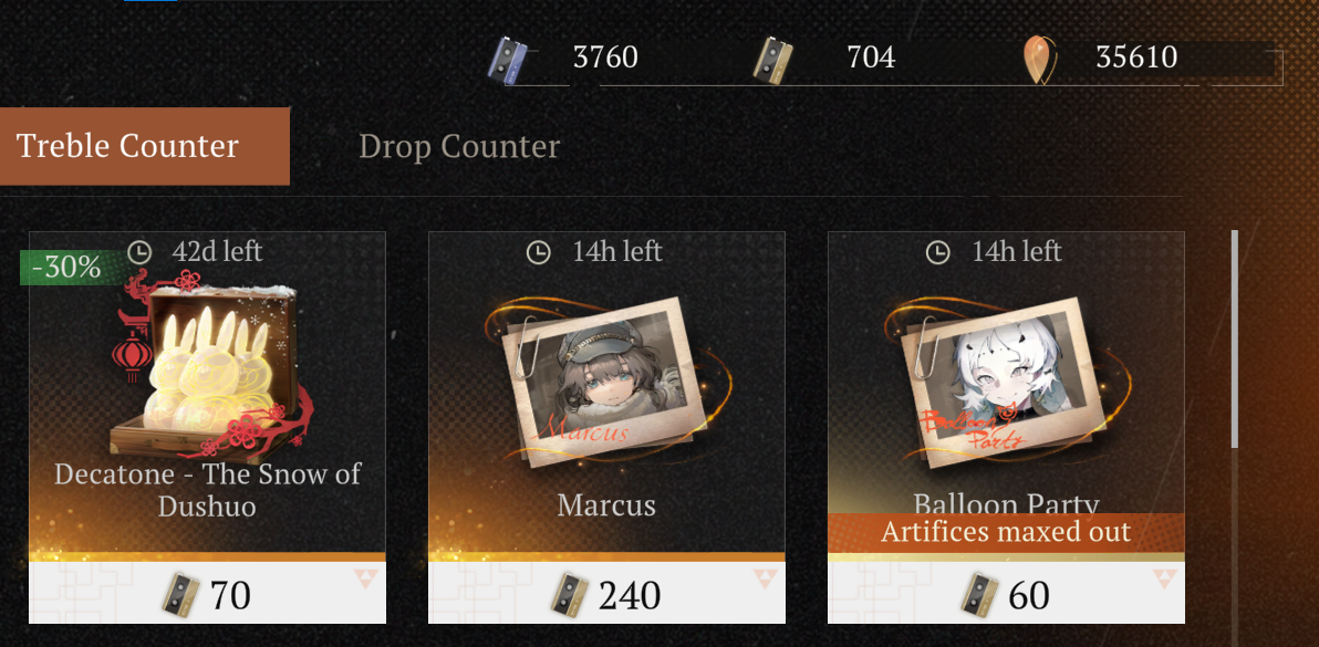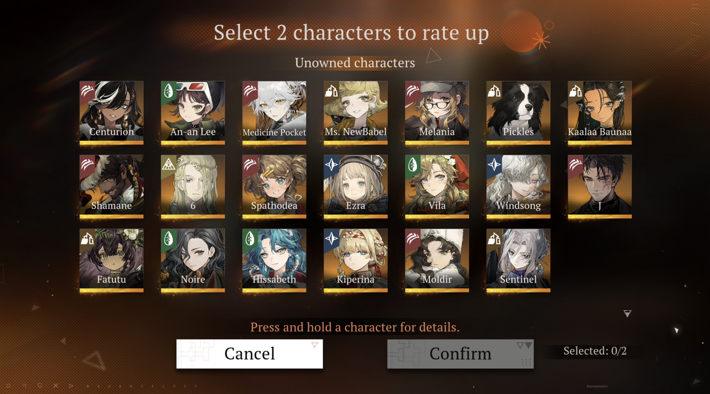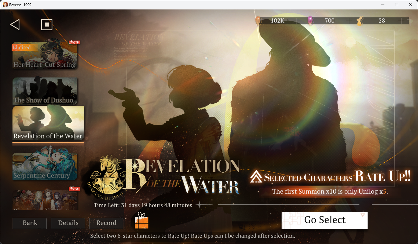 Previous Era: >>563400816>General InfoReverse: 1999 is a turn-based RPG gacha with gameplay revolving around the use of spell cards. The game focuses on storytelling, with a rich main story mode and frequent side story events. The game is fully voiced in 4 languages, with English as the primary one. There are no PvP elements, so you can play at your own pace.Daily reset is at 5AM UTC-5GL 3.3 - http://youtu.be/spX-FcQFbeA / http://youtu.be/OGu0uery7FcCN 3.4 - http://youtu.be/lWQ4YSOZneg / http://youtu.be/7Uix021yVBECN 3.5 - http://youtu.be/x6a8HUxHyGwCN 3.6 - http://youtu.be/MuGYHKb72EM03/05 - 04/13 | THE CAMPAIGN'S TALE>Current Content03/05 - 04/16 | Tides of Thought03/05 - 05/28 | The Syndrome of Silence: Vol. 203/07 - 04/16 | Mane's Bulletin03/26 - 04/16 | Igor - Into the Maelstrom03/26 - 04/16 | 8-Bit Arcade Remix04/09 - 04/16 | Special Issue on the East: Huanzhou Spring (3.4 Teaser)>Upcoming Content04/16 - 05/28 | Patch 3.4 - Spring Unending>Current Banners03/05 - 04/16 | ◈ | Euphoria Rate-Up 1x100%: An-an Lee, Getian, Isolde, Kaalaa Baunaa, Melania, Mercuria03/26 - 04/16 | ※ | Igor (Beast) http://youtu.be/6wZakHlZ2VY | http://youtu.be/XkuZ97PBTVs04/04 - 05/28 | ◉ | 10x10 FREE SUMMONS04/07 - 04/21 | ⟳ | Hissabeth (Plant)>Upcoming Banners04/16 - 05/18 | ⨉ | Revelation of the Water: Pick 2, 70% Rate-Up04/16 - 05/28 | ◷ | Paper Heron (Plant) http://youtu.be/vlw5IWHMPys | http://youtu.be/6B5MG8GTdA404/16 - 05/28 | ◈ | Euphoria Rate-Up 1x100%: 6, A Knight, An-an Lee, Regulus, Sotheby, Tooth Fairy, Voyager, Willow>[ Download ] http://re1999.bluepoch.com | http://store.steampowered.com/app/3092660>[ Resources ] http://rentry.org/1999-resources>[ Merchandise ] http://reverse1999.store>Codes1999GIFT, 5YRBRF9, GachaGaming1999, MainStoryChapt12, KnightsDuty, RestlessSouls, NoMercy, DeadSilence, LastDefence, UndyingLight, PaperHeronLiveHost0404, HalfAnnivLive0404, PastShadows, NewScars, 2.5AnnivCelebration, GatetoLongevity