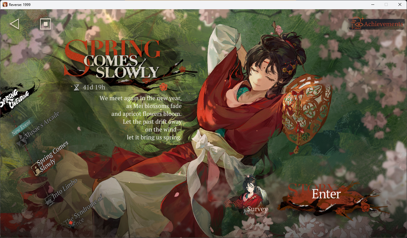 >>563659641Web events:04/07 - 04/16 | Pre-Registration - http://reverse1999.bluepoch.com/en/event/2_half_anniversary_pre_registration/04/10 - 05/21 | https://reverse1999.bluepoch.com/en/event/asliverofspring/04/10 - 05/21 | https://reverse1999.bluepoch.com/en/event/endlessstream/[Update Maintenance Duration]04/16 | 05:00 - 10:00 (UTC-5)04/16 - 05/25 | SPRING UNENDING>Upcoming Content03/05 - 05/28 | The Syndrome of Silence: Vol. 204/16 - 05/25 | Editor's To-Do List04/16 - 05/28 | Paper Heron - Spring Comes Slowly04/16 - 05/28 | Laplace's Internal Forum04/16 - 05/28 | Greetings from the Suitcase04/16 - 05/28 | Mane's Bulletin04/16 - 05/28 | Musae's Arcade (New Mode, Multiplayer)04/16 - 05/28 | Tides of Thought05/01 - 05/11 | 2x [The Poussiere] Rewards05/01 - 05/15 | Getian - A Song Once Heard05/01 - 05/28 | Pre-Storm Protocol v305/07 - 05/28 | Cheng Heguang - To Slay a Tiger05/15 - 05/25 | Showdown in Chinatown (2.5 Rerun)05/21 - 05/28 | Carving on the Sun Stone (3.5 Teaser)>Upcoming Banners04/21 - 05/05 | ⟳ | Rubuska (Mineral)05/01 - 05/22 | ⧖ | Liang Yue (Star)05/01 - 05/22 | ⧖ | Anjo Nala / Jiu Niangzi / Lucy05/05 - 05/19 | ⟳ | Noire (Plant)05/07 - 05/28 | ※ | Cheng Heguang (Star) http://youtu.be/fqbrZaKfRDA | http://youtu.be/wxVmEp_Yu-Q05/19 - 06/02 | ⟳ | Kakania (Plant)
