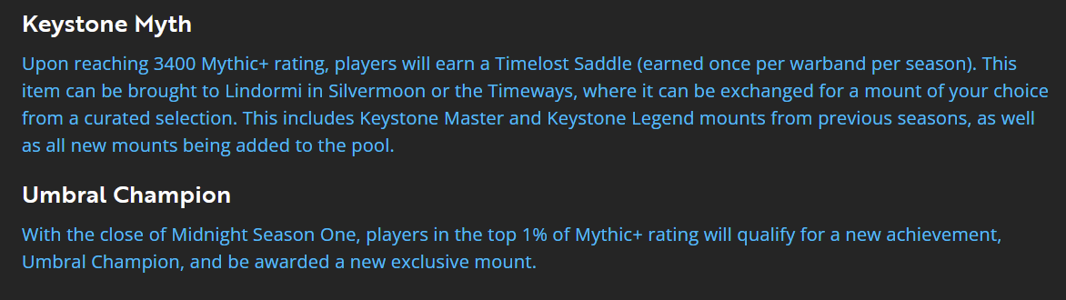 Upon reaching 3400 Mythic+ rating, players will earn a Timelost Saddle (earned once per warband per season). This item can be brought to Lindormi in Silvermoon or the Timeways, where it can be exchanged for a mount of your choice from a curated selection. This includes Keystone Master and Keystone Legend mounts from previous seasons, as well as all new mounts being added to the pool.With the close of Midnight Season One, players in the top 1% of Mythic+ rating will qualify for a new achievement, Umbral Champion, and be awarded a new exclusive mount.OH NO NO NO NO NO NO NO NO NO NO NO NO NO NOAHAHAHAHAHAHAHAHAHAHAHAHAHAHA