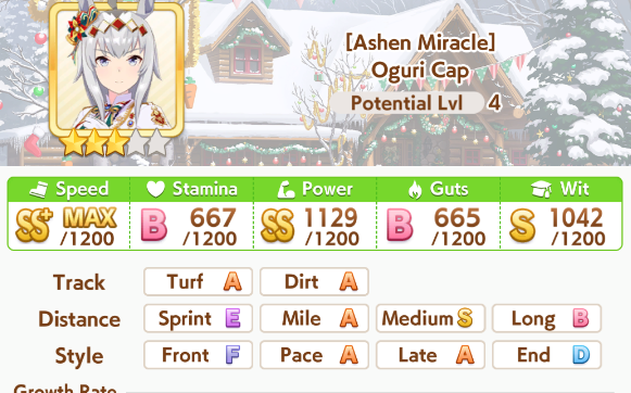 >>563673043>Maru has no useful skill for Lates.This is true, she's a pure stat stick>Dauntless is good, and so is Surge and Savvy, which you can also get for Paces alongside Head-On.Dauntless is OK, slick surge you're probably getting from Neicha and calling the savvy skills good is a stretch. No pace chaser is using this card when you can get golden head-on from daiwa.>Biko Powerif you plan on rolling for every support card then none of this discussion matters. You obviously just plan on spending money, so budget (the whole reason you would cope with a 1lb maru stat stick) becomes irrelevant>Nature Wit has a Max Energy event.True I forgot about that one since I was only only looking at upcoming stuff>If you want Eishin instead, she has a Max Energy event.Yeah instead of the mediocre Pearl card>Light Hello’s first date is a Max Energy event, and A&G has a Max Energy date too.Fair enough, didn't know about those>Meanwhile, Maru has half the specialty priority and is mediocre for most of your run outside of Summer.She's high variance with that spec prio for sure, but she also just works and doesnt need all of those other events.