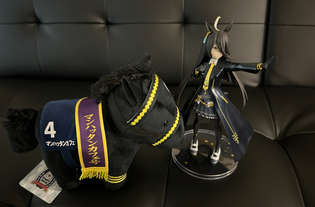 Okay, now I definitely need to buy a new shelf. Both look pretty cute, and the horse plush was bigger than I expected. For now Cafe will sit next to my kuuga csm and the krieg models