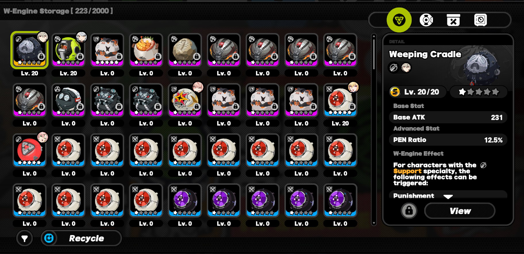 Newfriend here, I've gotta equip Seed and Cissia but I don't know what the hell to do with my wengines. Here's what I've got available:Nekomata's sig at 1*Gilded Blossom (that outpost wengine) at 5*Anton's sig at 5*Street Superstar at 1*Starlight Engine (not Billy's one) at 3*Gilded Blossom and Anton's seem good but I don't know which is best for which agent. I'm not really planning to roll the next few patches so I might go for one or both of their signature wengines but in that case which is more valuable to pull for first?