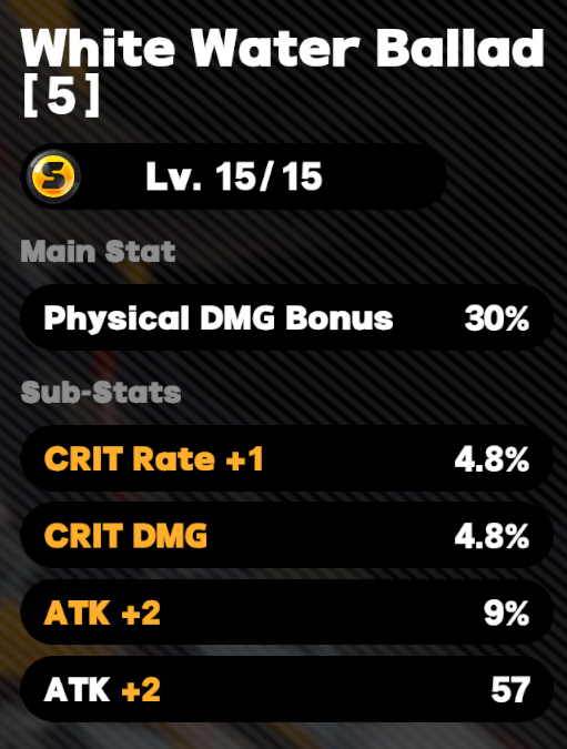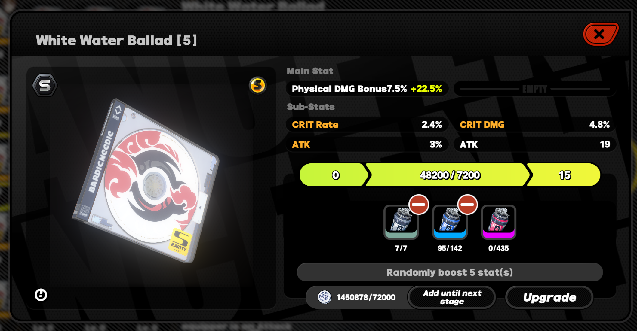 I’m >>563709758 and just switched discs, also raised her attack a bit. Engine is still level 59. I hope this is better 65+15=80 crit rate