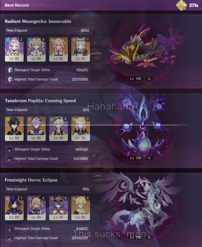 Alright I fucking kneel, I can't go higher than this because the next level up of the Gecko is so bullshit. I can't even switch Albedo to help with it because the GEO BOSS is an ANTI-ALBEDO BOSS.
