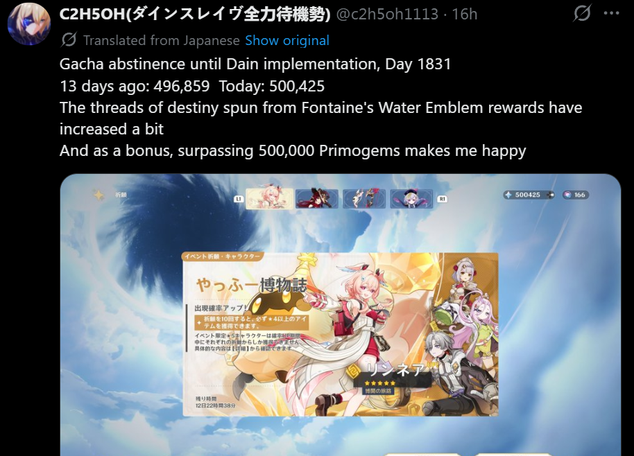 Previous: >>563660248>Character Trailer - "Linnea: Precise Answers, Curious Wonders!"https://youtu.be/G3VvCIa-jB0 [Embed] (EN)https://youtu.be/L86-DeBY2LM [Embed] (JP)>Character Teaser — "Linnea: Companion on a Rainy Night"https://youtu.be/6YiuyqftA8U [Embed] (EN)https://youtu.be/Ojd3Ln6_YEU [Embed] (JP)>Version "Luna VI" "Augured Homecoming" Trailerhttps://youtu.be/mVWLSzkpGzA [Embed] (EN)https://youtu.be/G6n5Zc3U0Ls [Embed] (JP)>Current character banner: Linnea, Chasca, Illuga, Aino, Noelle>Current weapon banner: Golden Frostbound Oath (Bow), Astral Vulture's Crimson Plumage (Bow)https://hoyolab.com/article/44512635>Daily check-in rewards (permanent)https://webstatic-sea.mihoyo.com/ys/event/signin-sea/index.html?act_id=e202102251931481&lang=en-us>Redeemable Codes with Primogems (all regions): https://genshin.mihoyo.com/en/giftGENSHINGIFTFairyGirlLinnea (NEW)8BHA0KFRG94KPSCA8NL4ZSPD>Useful Links (Wiki, Simulators, Maps, Character Builds, /gig/ friendlist, Third-Party Tools, etc.)https://rentry.org/giglinks/gig/ OP pastebin (use this if making new thread):https://pastebin.com/ca0zseQ9