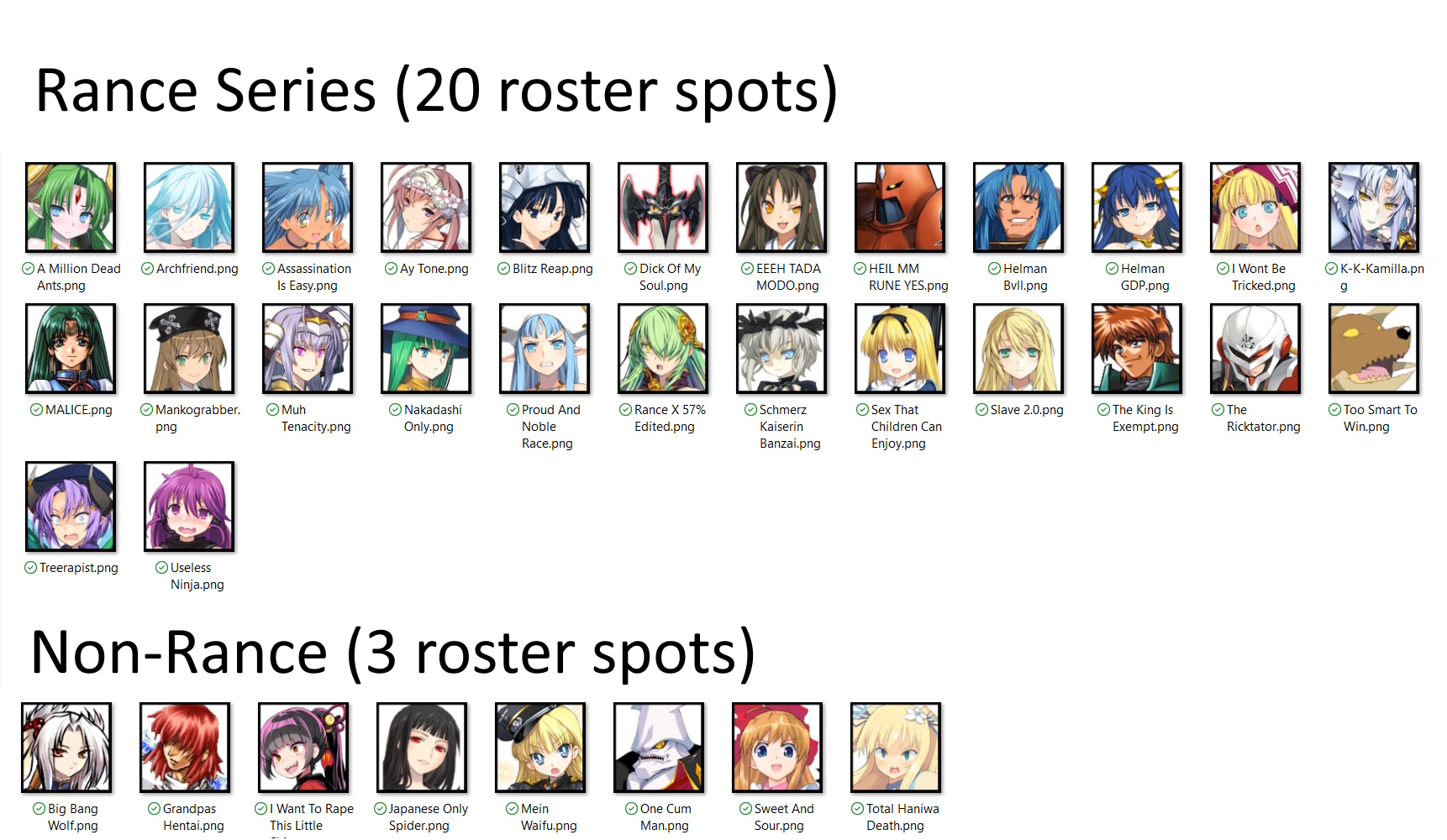 >>563692401>>563427408And the VGL roster poll will continue for the next 3 and a bit more than a half days. There are 23 roster spots - 20 for characters from the Rance series and 3 for characters from Alicesoft's other games.The top 5 polling players will be medal players with higher stats than regular players.Team Wiki Pagehttps://implyingrigged.info/wiki//hanny/Match Archivehttps://implying.fun/team/hanny/The poll has two questions1. To vote for 20 out of 26 Rance candidates2. To vote for 3 out of 8 Non-Rance candidates>Poll Linkhttps://s.surveyplanet.com/jex8m4m3