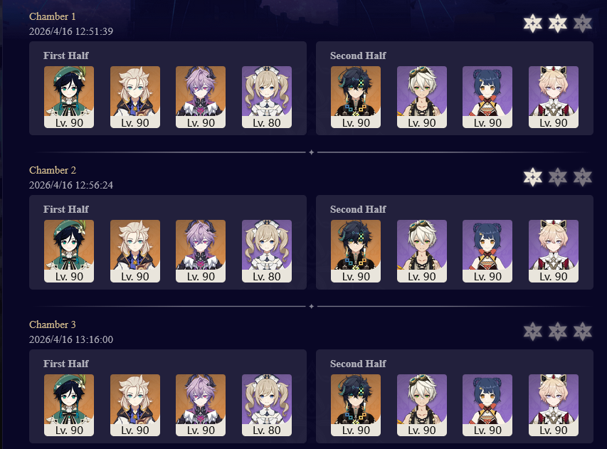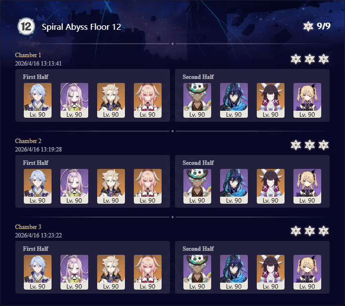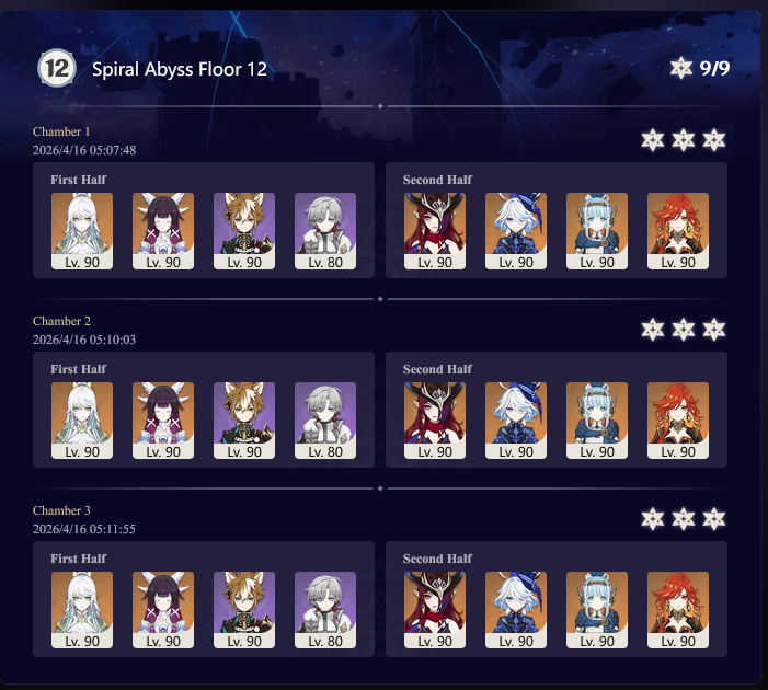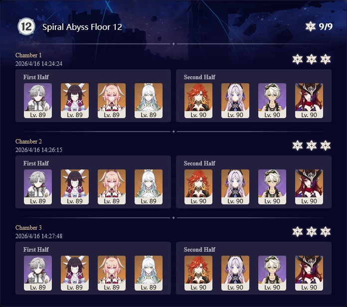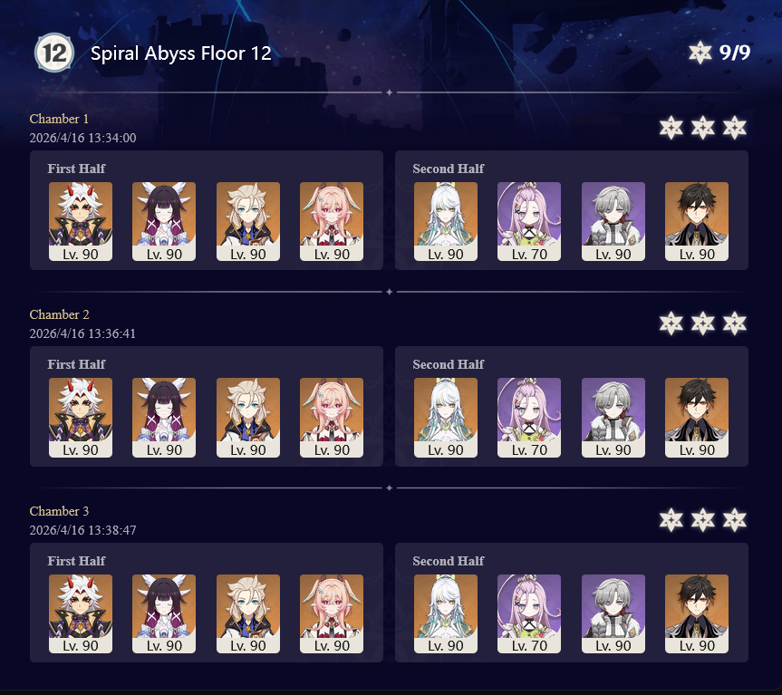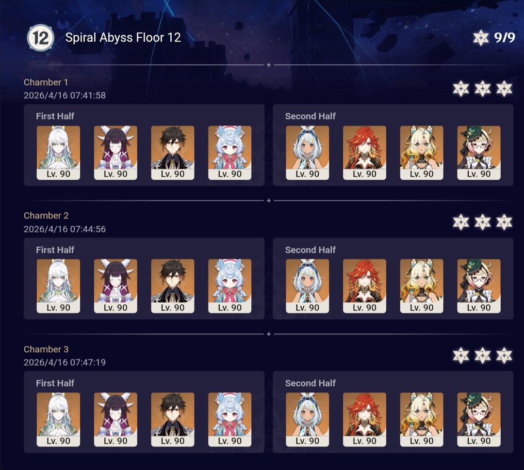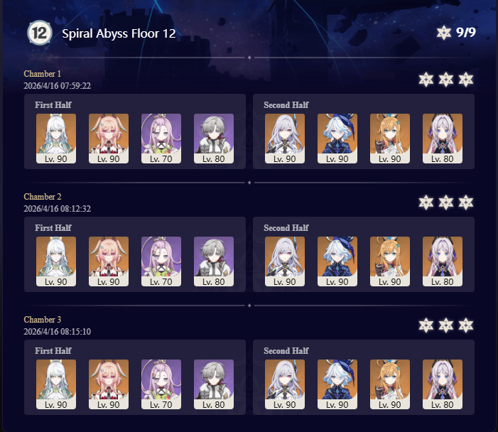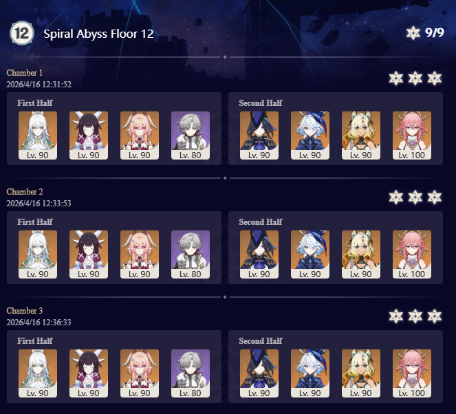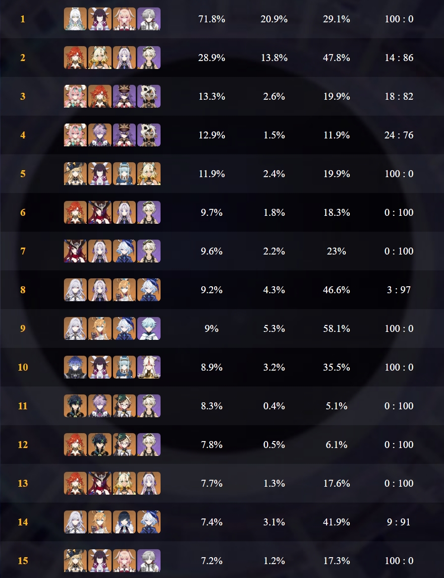 Here to collect your Stygian and Abyss Clears, bwosPost them when you're ready!--------->Too shy to post or just wanted to make sure I get your clear?>Can't solve captcha to post?Send them to me privately here:>Stygian Onslaught:https://www.jotform.com/253431076926459>Spiral Abyss:https://form.jotform.com/253493679126468--------->PREVIOUS ABYSS | PREVIOUS ABYSS | PREVIOUS ABYSS | PREVIOUS ABYSS | PREVIOUS ABYSS |Luna IV 2026-03-16 Spiral Abyss StatisticsSample size: 156 (4/gig/, 8/gig/, /gigvmg/ and /v/)Finalized: 2026-04-15Character Usage (List view):https://files.catbox.moe/dj2l6t.pngOther Statistics:https://files.catbox.moe/bvwt8t.png---------Congratulations to these anons for being:"4/gig/'s Top 10 SOVLFVL clears of Spiral Abyss 2026-03-16 Luna IV"#1. Clear #124 - >560746428 - 971 points#2. Clear #18 - >560526502 - 949 points#3. Clear #54 - >560548597 - 934 points#4. Clear #98 - >560619028 - 930 points#5. Clear #75 - >560579708 - 927 points#6. Clear #101 - >560633858 - 927 points#7. Clear #140 - >560781170 - 886 points#8. Clear #35 - >560532980 - 885 points#9. Clear #80 - >560585029 - 878 points#10. Clear #102 - >560635295 - 873 pointsLeaderboard (4/gig/ on /vg/): https://files.catbox.moe/cgb8lq.pngLeaderboard (8/gig/ on /gacha/): https://files.catbox.moe/wj2teu.png---------How is the ranking tabulated?Every submissions get 1000 points as default grade,then the grade will be reduced based on voting data of this poll(Vote if you haven't/ Change your vote:https://strawpoll.com/B2ZB9wmqAgJ) (Linnea Option added)Submissions with similar grade will then be ranked by the order of submission time(earlier submission gets higher rank)