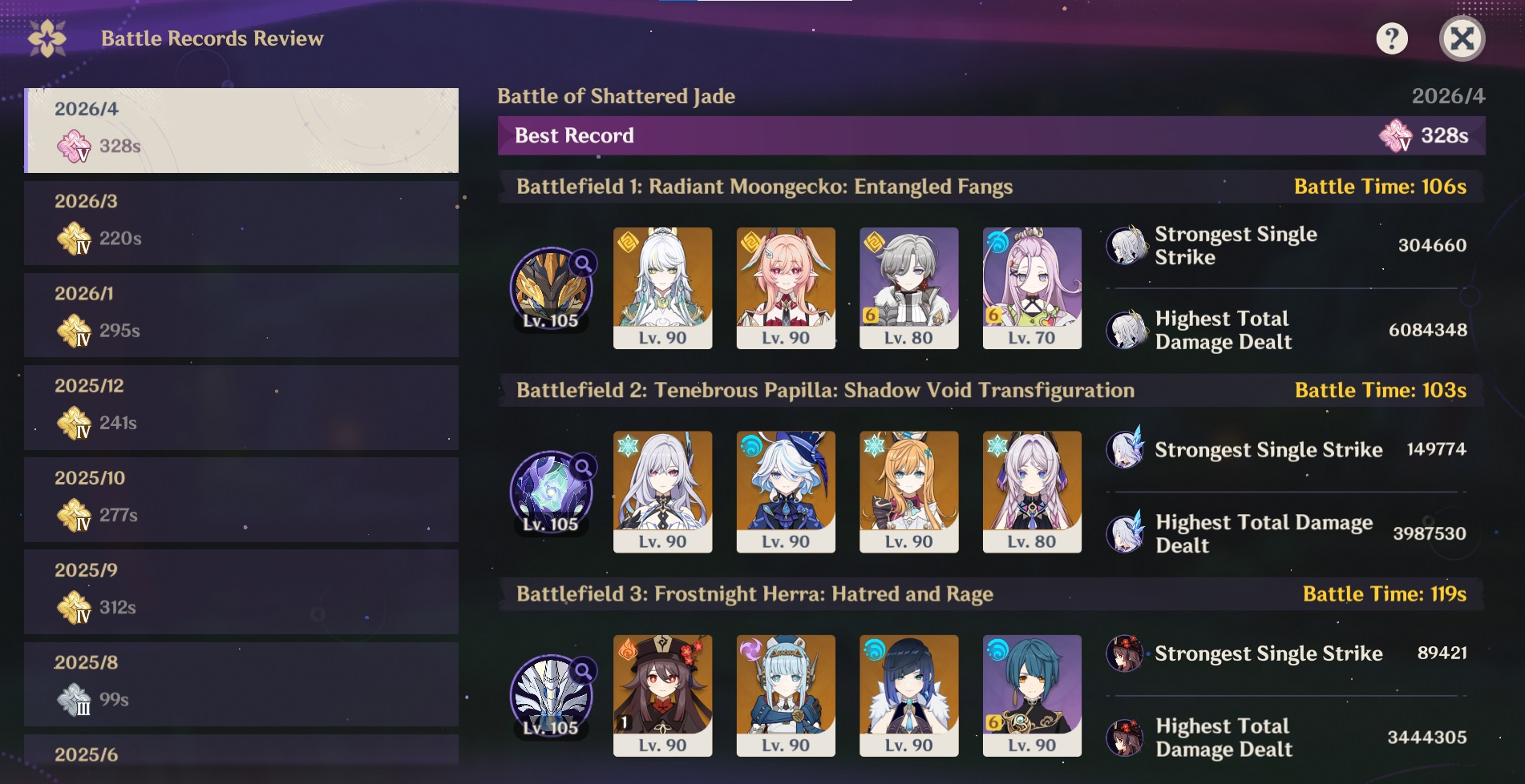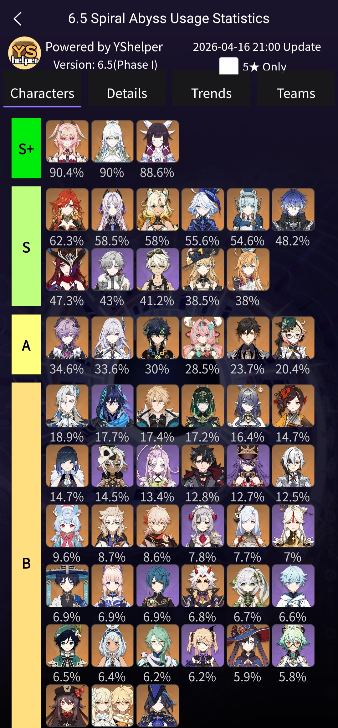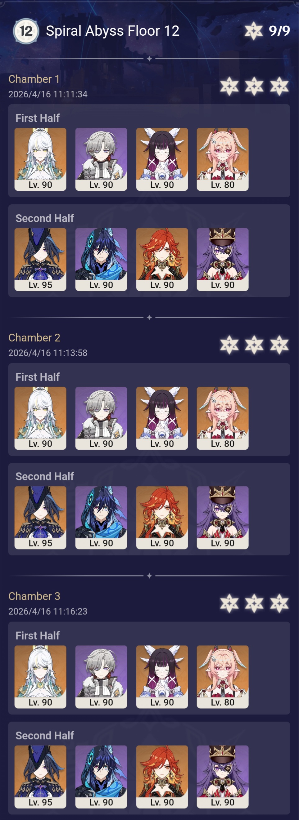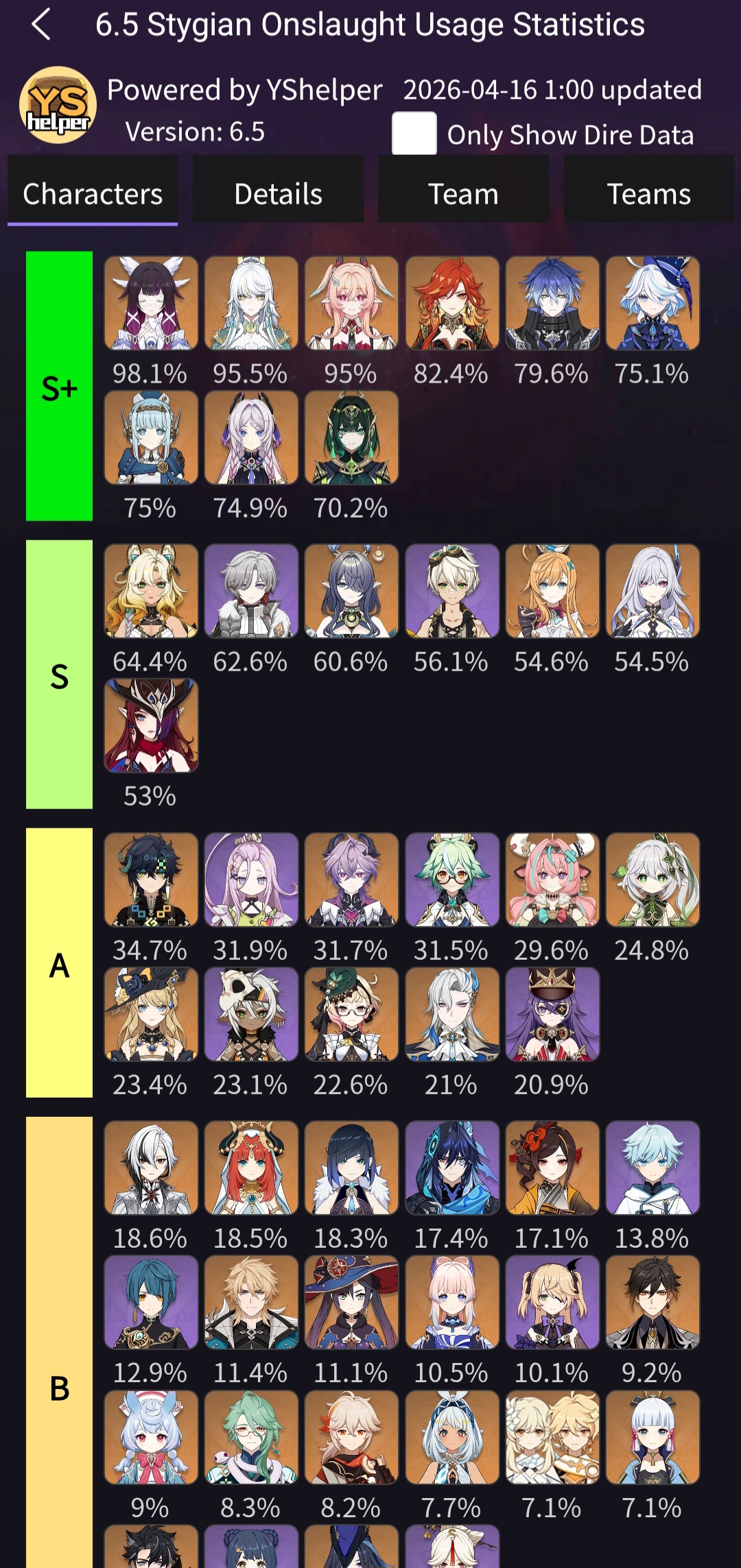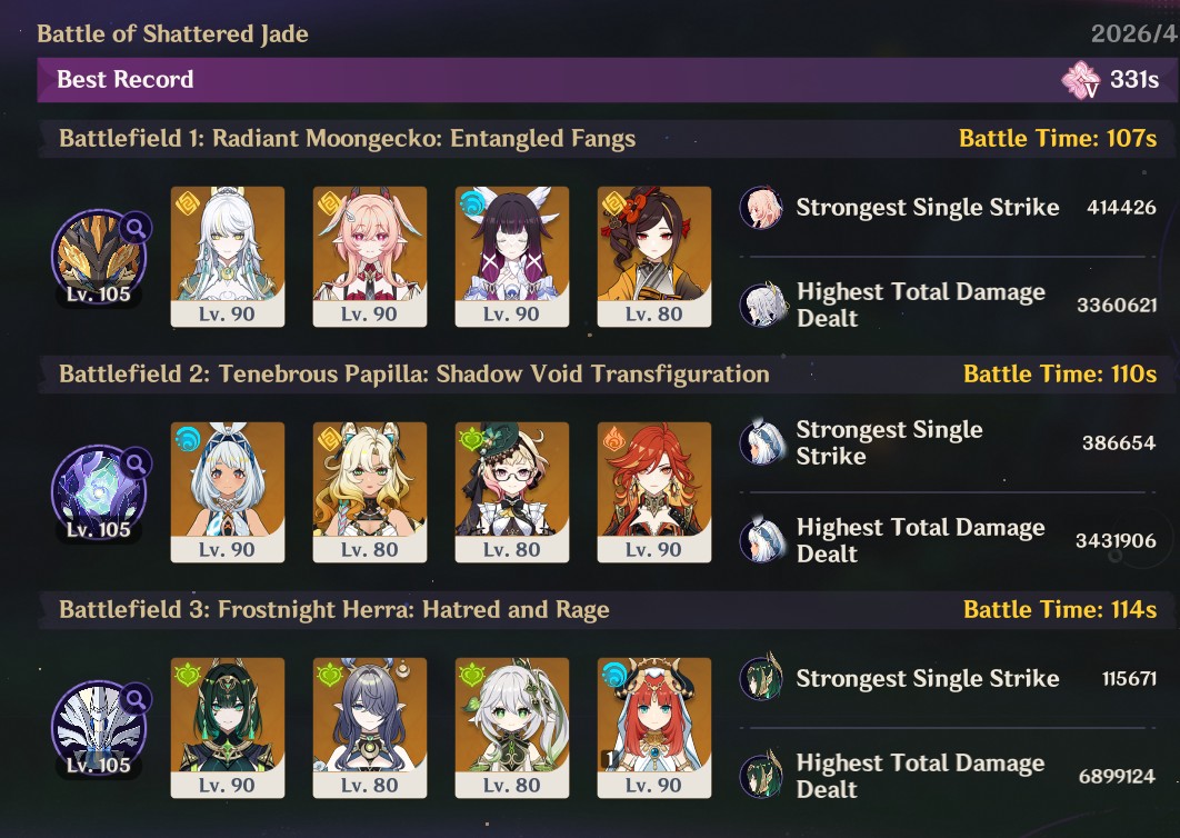 Here to collect your Stygian and Abyss Clears, bwosPost them when you're ready!--------->Too shy to post or just wanted to make sure I get your clear?>Can't solve captcha to post?Send them to me privately here:>Stygian Onslaught:https://www.jotform.com/253431076926459>Spiral Abyss:https://form.jotform.com/253493679126468--------->PREVIOUS ABYSS | PREVIOUS ABYSS | PREVIOUS ABYSS | PREVIOUS ABYSS | PREVIOUS ABYSS |Luna IV 2026-03-16 Spiral Abyss StatisticsSample size: 156 (4/gig/, 8/gig/, /gigvmg/ and /v/)Finalized: 2026-04-15Character Usage (List view):https://files.catbox.moe/dj2l6t.pngOther Statistics:https://files.catbox.moe/bvwt8t.png---------Congratulations to these anons for being:"4/gig/'s Top 10 SOVLFVL clears of Spiral Abyss 2026-03-16 Luna IV"#1. Clear #124 - >560746428 - 971 points#2. Clear #18 - >560526502 - 949 points#3. Clear #54 - >560548597 - 934 points#4. Clear #98 - >560619028 - 930 points#5. Clear #75 - >560579708 - 927 points#6. Clear #101 - >560633858 - 927 points#7. Clear #140 - >560781170 - 886 points#8. Clear #35 - >560532980 - 885 points#9. Clear #80 - >560585029 - 878 points#10. Clear #102 - >560635295 - 873 pointsLeaderboard (4/gig/ on /vg/): https://files.catbox.moe/cgb8lq.pngLeaderboard (8/gig/ on /gacha/): https://files.catbox.moe/wj2teu.png---------How is the ranking tabulated?Every submissions get 1000 points as default grade,then the grade will be reduced based on voting data of this poll(Vote if you haven't/ Change your vote:https://strawpoll.com/B2ZB9wmqAgJ) (Linnea Option added)Submissions with similar grade will then be ranked by the order of submission time(earlier submission gets higher rank)