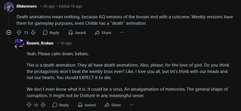 >>563742019>Let it goI'm not a dottorfag to let go. I just don't believe he'll die so easily (if he even dies at all), let alone during the filler region. Unless the writers decided to move the Irminsul burning plot that was supposed to be right before Snezhnaya or after to earlier patch to simply get rid of him as a character because they have bigger antagonists in mind.