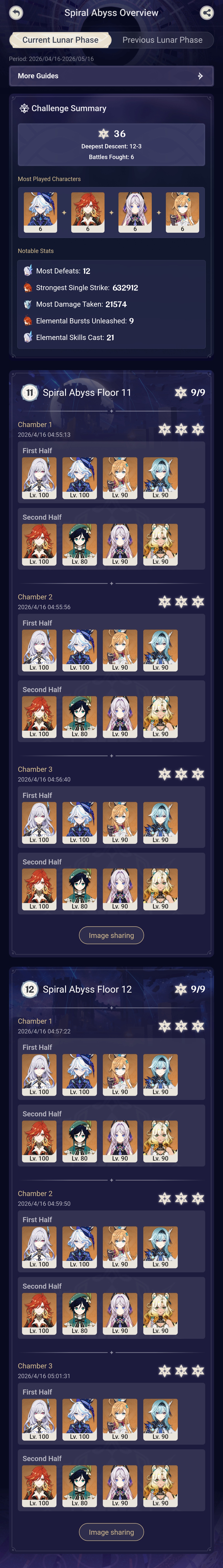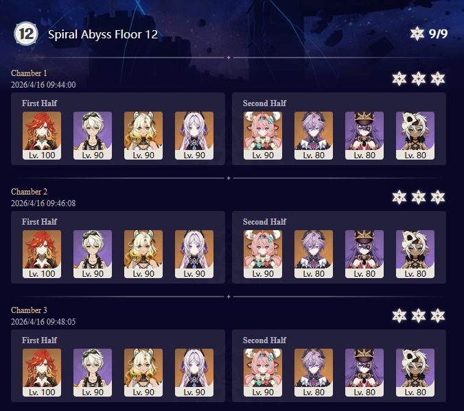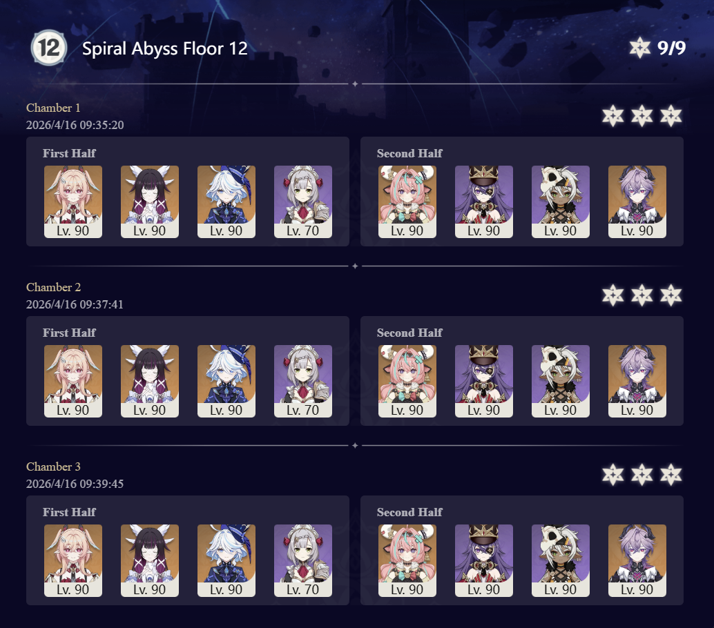 Here to collect your Stygian and Abyss Clears, bwosPost them when you're ready!--------->Too shy to post or just wanted to make sure I get your clear?>Can't solve captcha to post?Send them to me privately here:>Stygian Onslaught:https://www.jotform.com/253431076926459>Spiral Abyss:https://form.jotform.com/253493679126468--------->PREVIOUS ABYSS | PREVIOUS ABYSS | PREVIOUS ABYSS | PREVIOUS ABYSS | PREVIOUS ABYSS |Luna IV 2026-03-16 Spiral Abyss StatisticsSample size: 156 (4/gig/, 8/gig/, /gigvmg/ and /v/)Finalized: 2026-04-15Character Usage (List view):https://files.catbox.moe/dj2l6t.pngOther Statistics:https://files.catbox.moe/bvwt8t.png---------Congratulations to these anons for being:"4/gig/'s Top 10 SOVLFVL clears of Spiral Abyss 2026-03-16 Luna IV"#1. Clear #124 - >560746428 - 971 points#2. Clear #18 - >560526502 - 949 points#3. Clear #54 - >560548597 - 934 points#4. Clear #98 - >560619028 - 930 points#5. Clear #75 - >560579708 - 927 points#6. Clear #101 - >560633858 - 927 points#7. Clear #140 - >560781170 - 886 points#8. Clear #35 - >560532980 - 885 points#9. Clear #80 - >560585029 - 878 points#10. Clear #102 - >560635295 - 873 pointsLeaderboard (4/gig/ on /vg/): https://files.catbox.moe/cgb8lq.pngLeaderboard (8/gig/ on /gacha/): https://files.catbox.moe/wj2teu.png---------How is the ranking tabulated?Every submissions get 1000 points as default grade,then the grade will be reduced based on voting data of this poll(Vote if you haven't/ Change your vote:https://strawpoll.com/B2ZB9wmqAgJ) (Linnea Option added)Submissions with similar grade will then be ranked by the order of submission time(earlier submission gets higher rank)