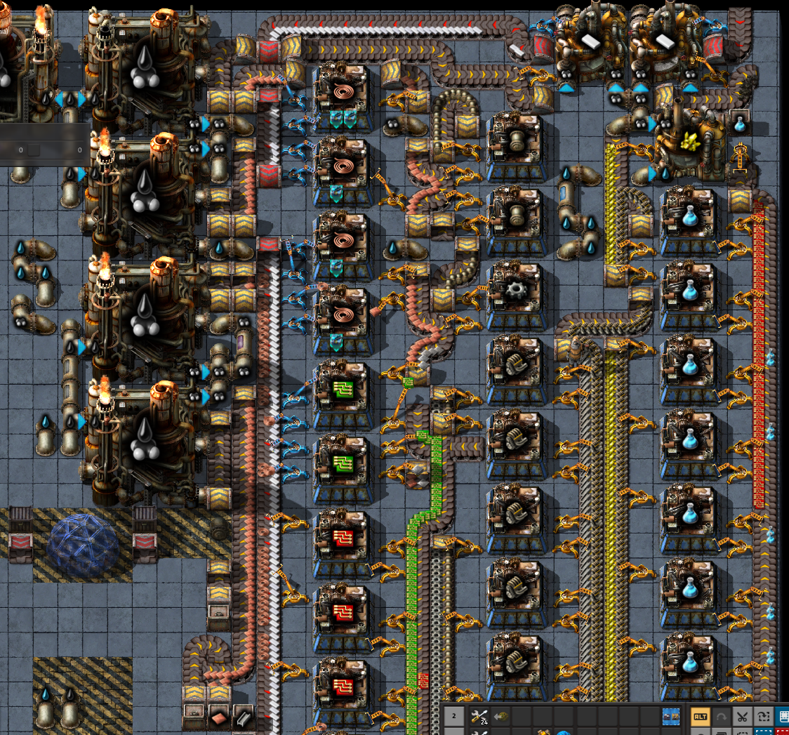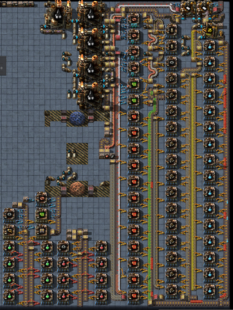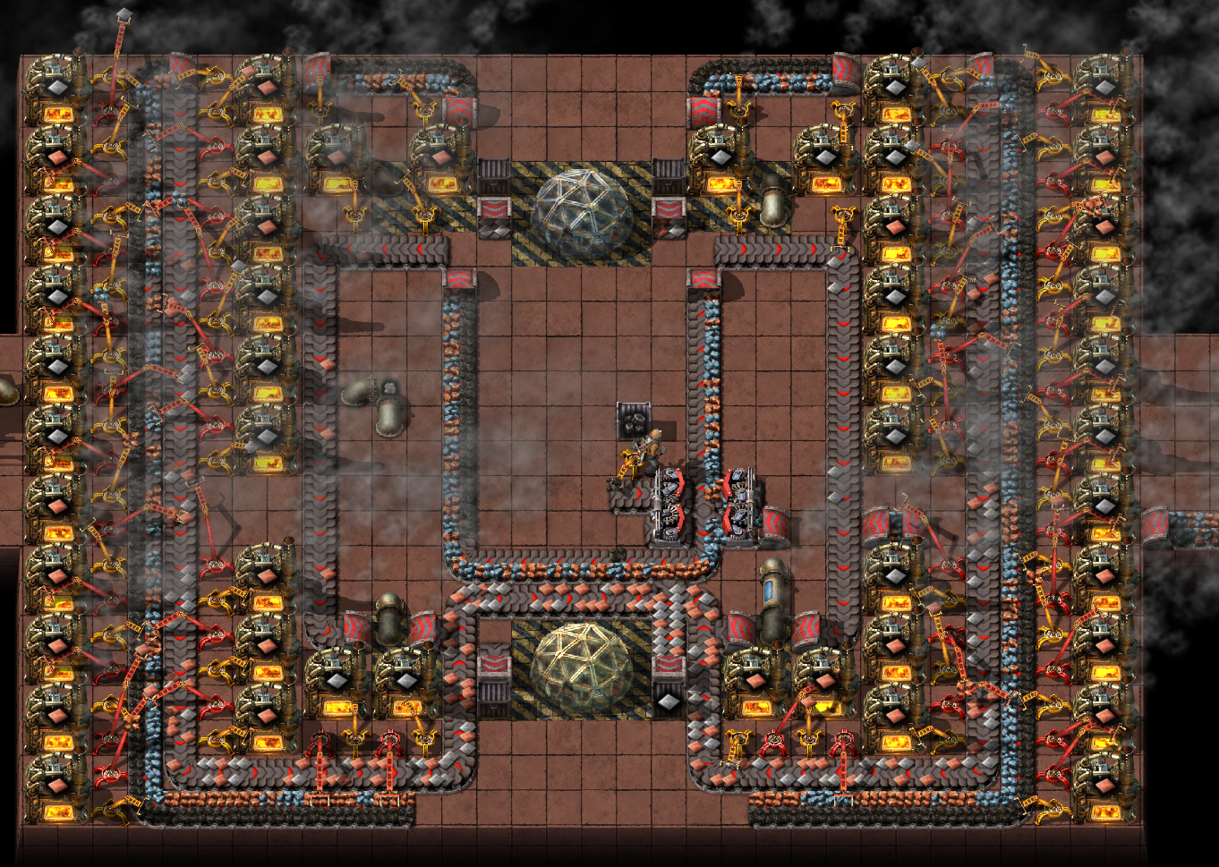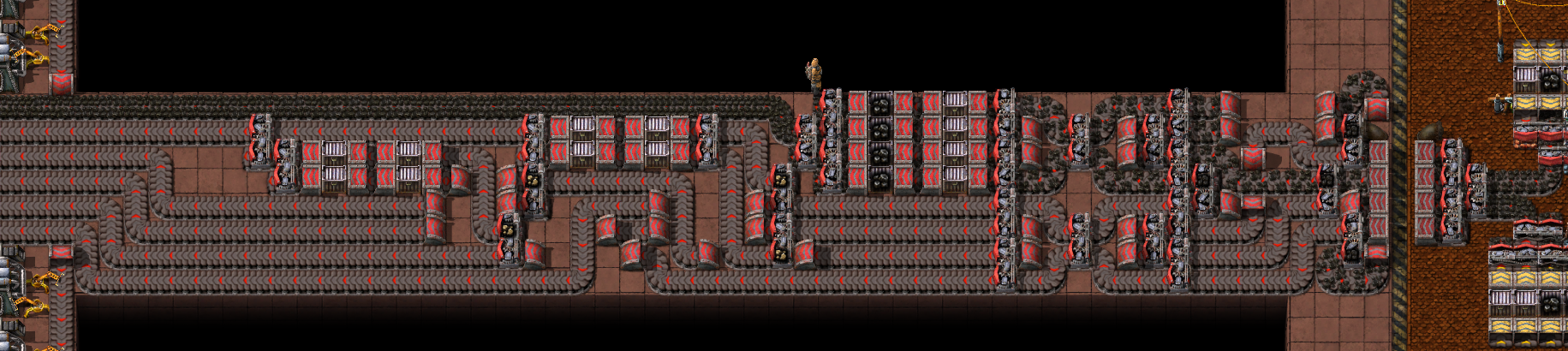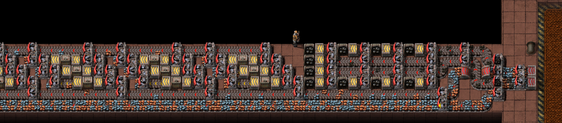 >>563986730shitpost aside here's my problem with that specific picturethere's 24 furnaces for each sidebut 24 steel furnaces can smelt 15 ore a second, which is half of a red beltthat entire thing is fed by a single half red belt of orethat means that at best it can give 15 ore, which means only half of it can work at any given time and that screenshot was taken only when the entire thing was backed up