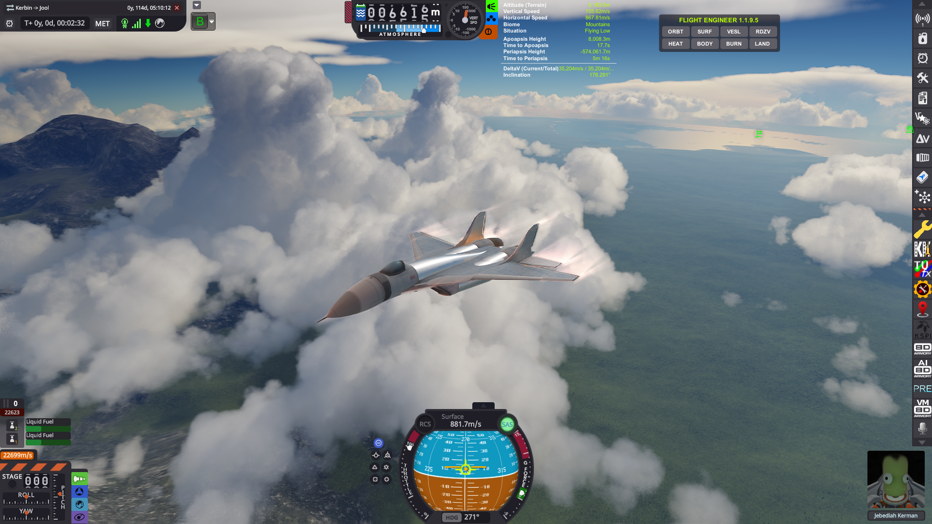 >>563770782there are mono tanks inside the plane's science bay but it's never been tested for this...>>563771118I managed to manually slow the plane enough with the main engines and had Kerwig EVA over while it drifted at about 0.6 m/s. Fortunately this thing has its solar panels to keep its reaction wheel operating.Kerwig is now on board the plane and ready for reentry.
