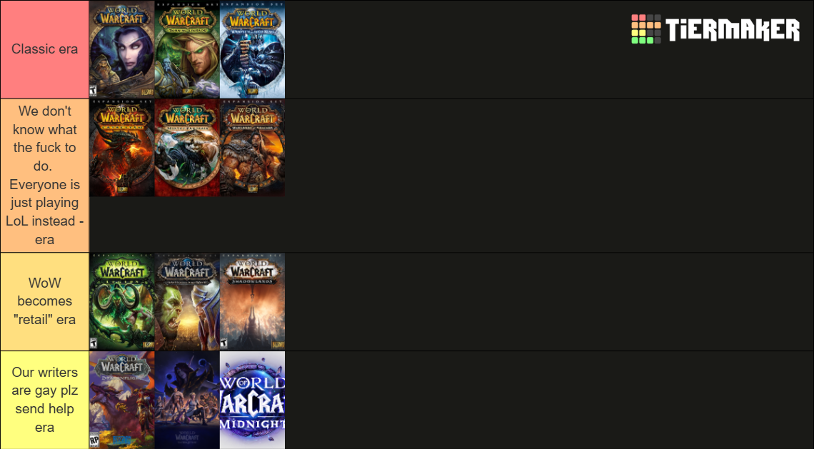 >WoWVanillaTBCWotLK>WoW2 CataMoP>WoW3 (NPC follower shit)WoDLegionBfA>WoW4 (Danuser and his leftovers)SLDFTWWMidnightTLTDiscuss