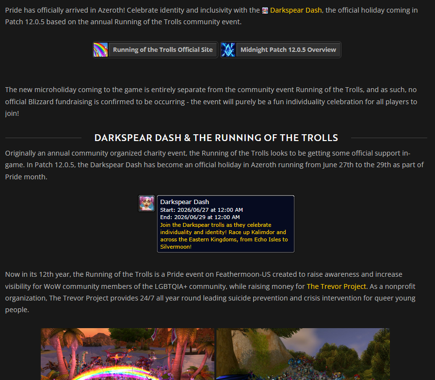https://www.wowhead.com/news/darkspear-dash-wows-first-official-pride-event-coming-in-patch-12-0-5-380974>rainbow faggot partySeriously?