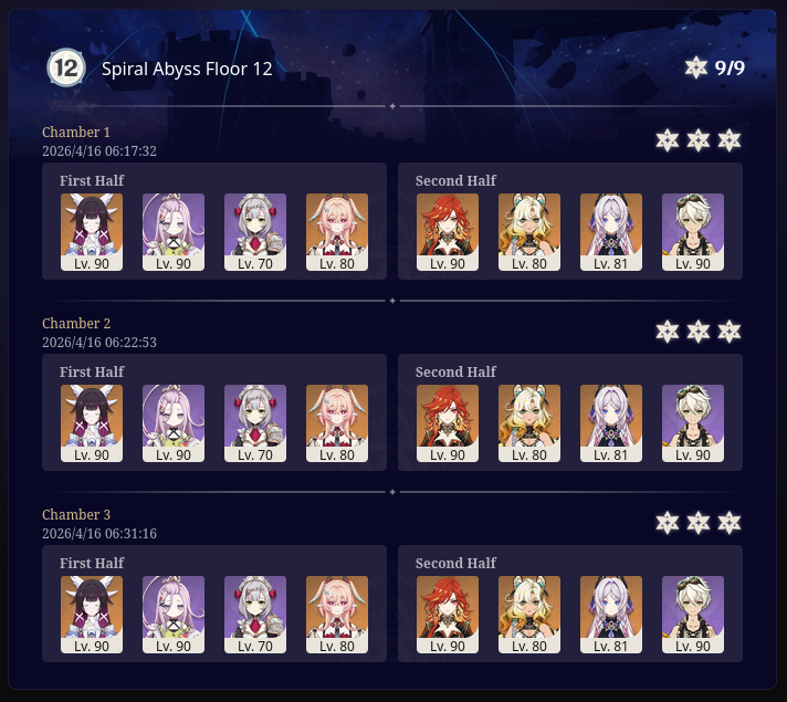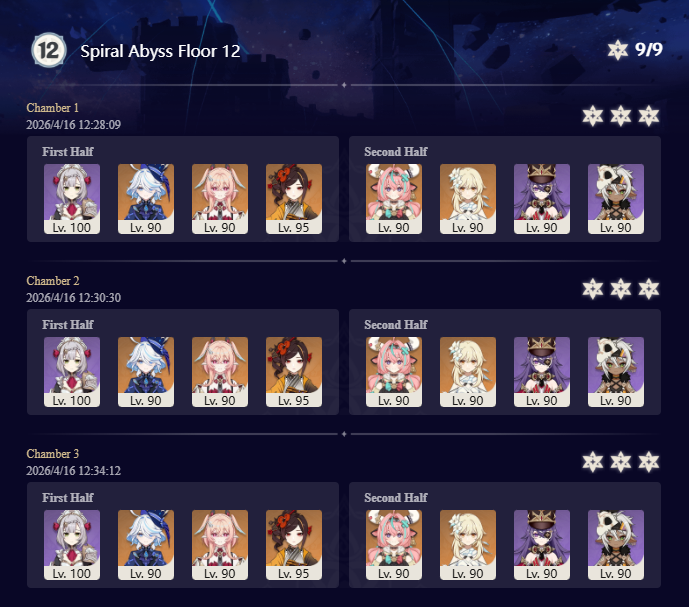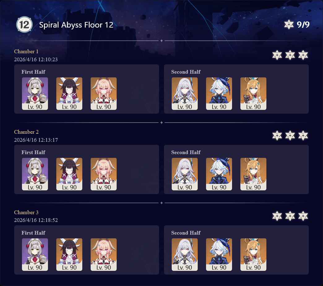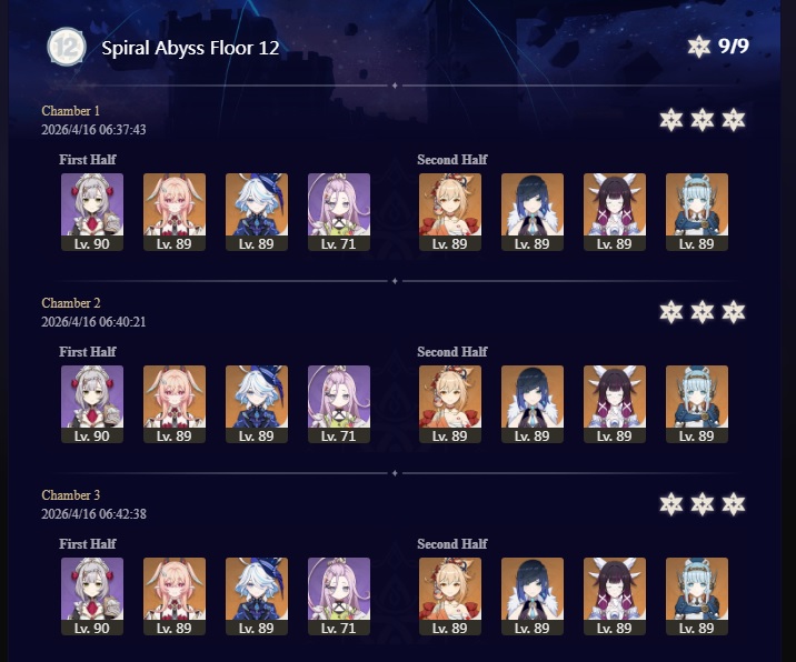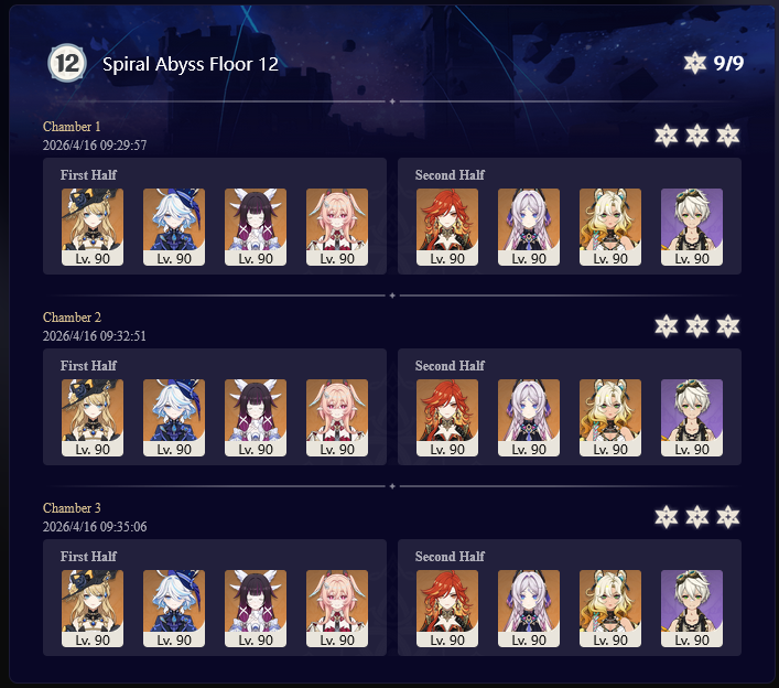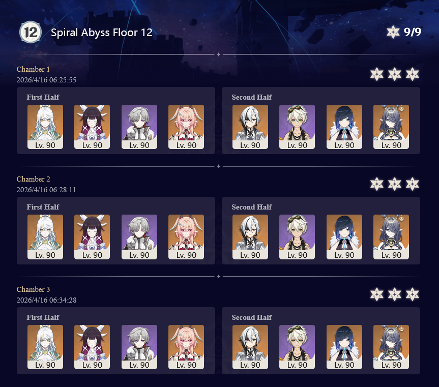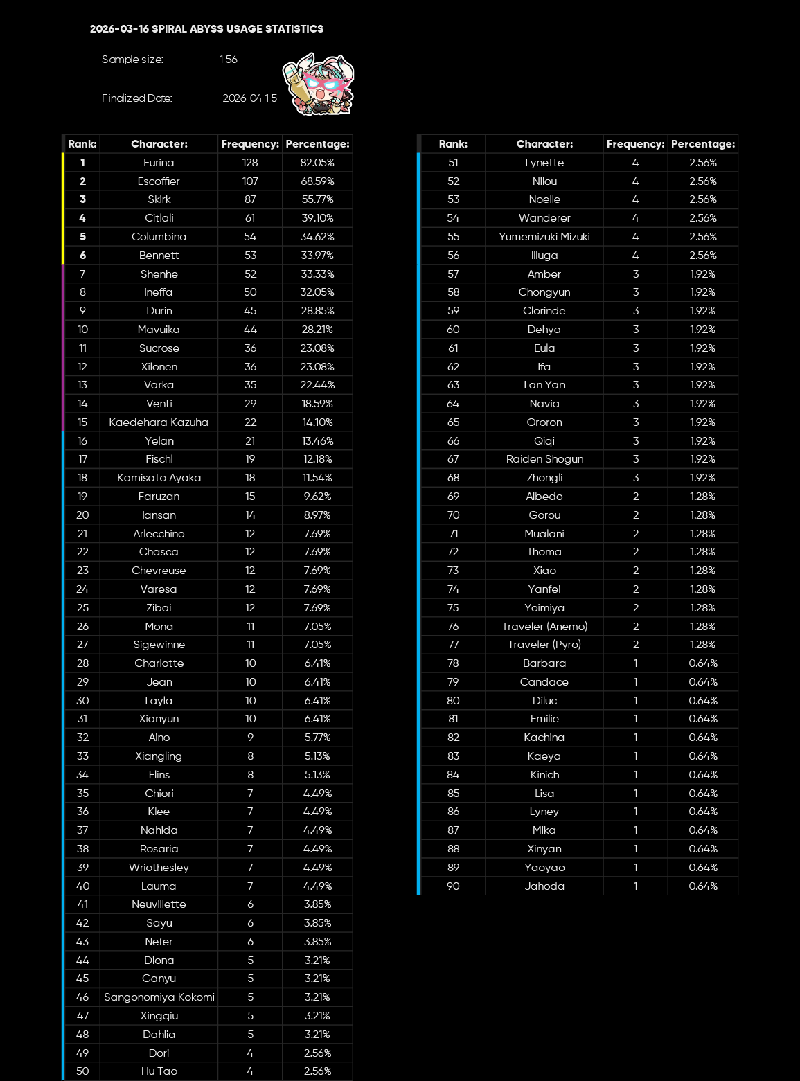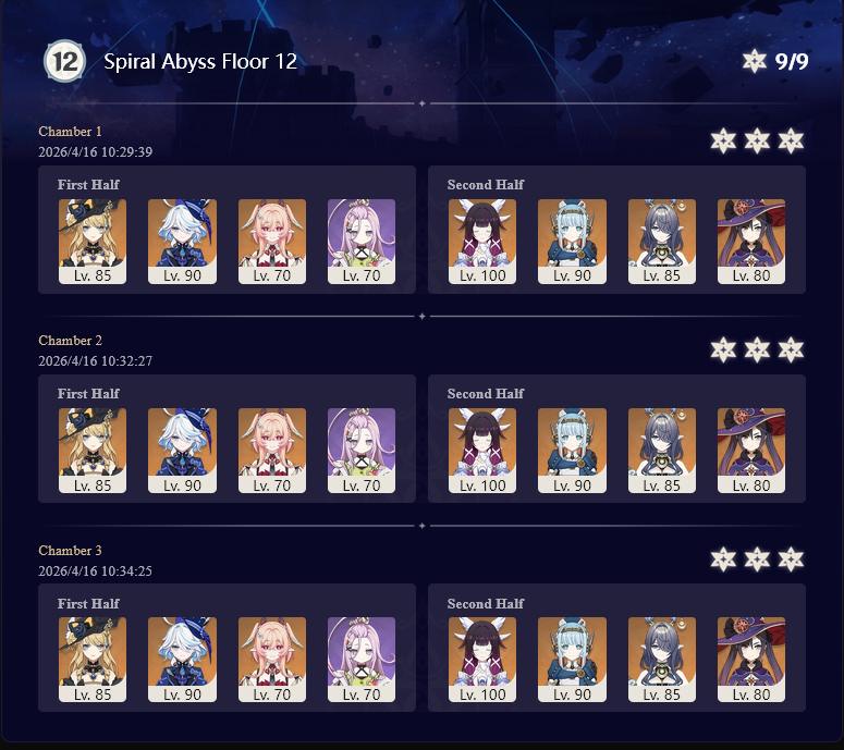 Here to collect your Stygian and Abyss Clears, bwosPost them when you're ready!--------->Too shy to post or just wanted to make sure I get your clear?>Can't solve captcha to post?Send them to me privately here:>Stygian Onslaught:https://www.jotform.com/253431076926459>Spiral Abyss:https://form.jotform.com/253493679126468--------->PREVIOUS ABYSS | PREVIOUS ABYSS | PREVIOUS ABYSS | PREVIOUS ABYSS | PREVIOUS ABYSS |Luna IV 2026-03-16 Spiral Abyss StatisticsSample size: 156 (4/gig/, 8/gig/, /gigvmg/ and /v/)Finalized: 2026-04-15Character Usage (List view):https://files.catbox.moe/dj2l6t.pngOther Statistics:https://files.catbox.moe/bvwt8t.png---------Congratulations to these anons for being:"4/gig/'s Top 10 SOVLFVL clears of Spiral Abyss 2026-03-16 Luna IV"#1. Clear #124 - >>/vg/560746428 - 971 points#2. Clear #18 - >>/vg/560526502 - 949 points#3. Clear #54 - >>/vg/560548597 - 934 points#4. Clear #98 - >>/vg/560619028 - 930 points#5. Clear #75 - >>/vg/560579708 - 927 points#6. Clear #101 - >>/vg/560633858 - 927 points#7. Clear #140 - >>/vg/560781170 - 886 points#8. Clear #35 - >>/vg/560532980 - 885 points#9. Clear #80 - >>/vg/560585029 - 878 points#10. Clear #102 - >>/vg/560635295 - 873 pointsLeaderboard (4/gig/ on /vg/): https://files.catbox.moe/cgb8lq.pngLeaderboard (8/gig/ on /gacha/): https://files.catbox.moe/wj2teu.png---------How is the ranking tabulated?Every submissions get 1000 points as default grade,then the grade will be reduced based on voting data of this poll(Vote if you haven't/ Change your vote:https://strawpoll.com/B2ZB9wmqAgJ) (Linnea Option added)Submissions with similar grade will then be ranked by the order of submission time(earlier submission gets higher rank)