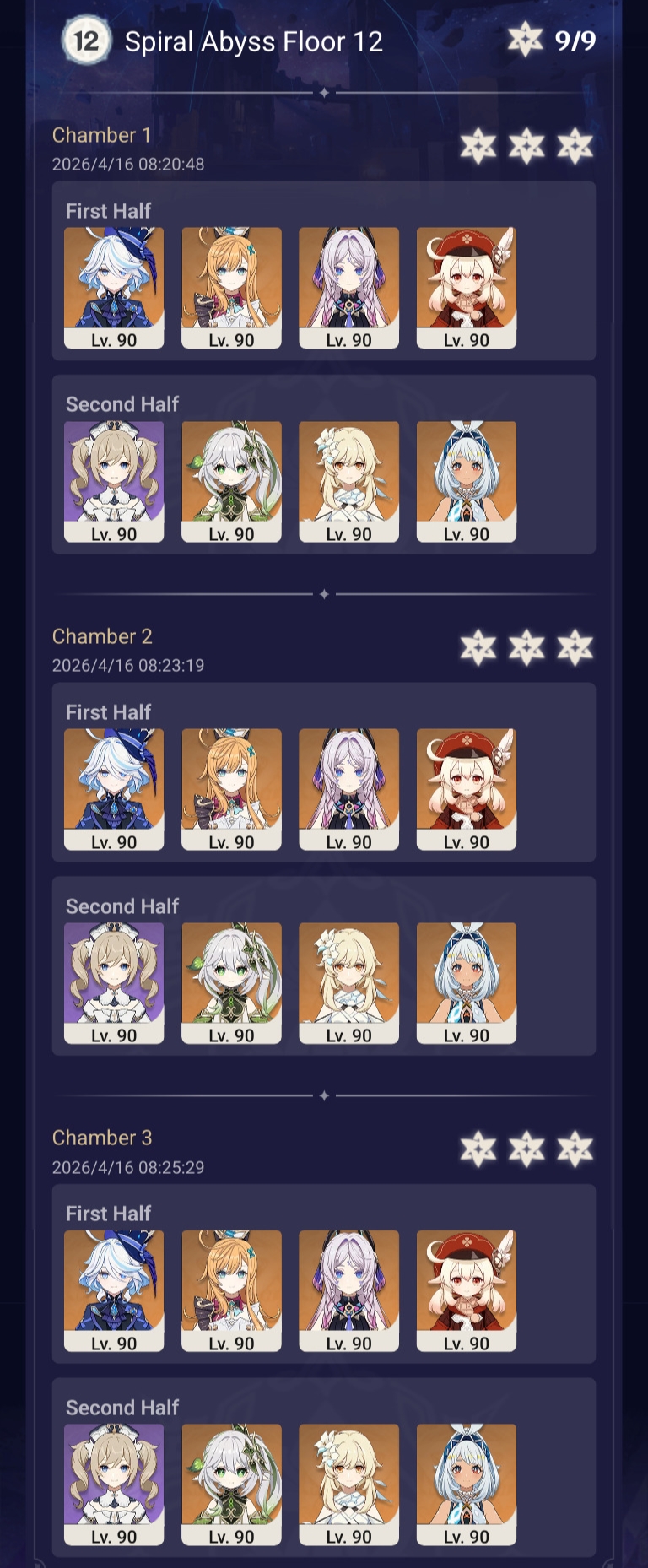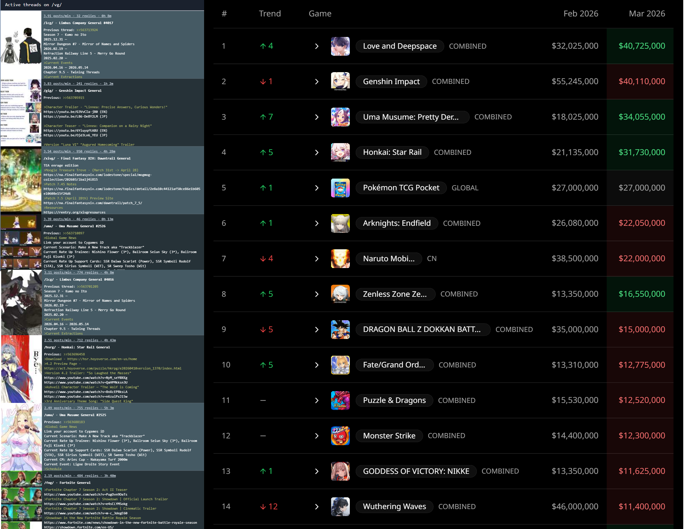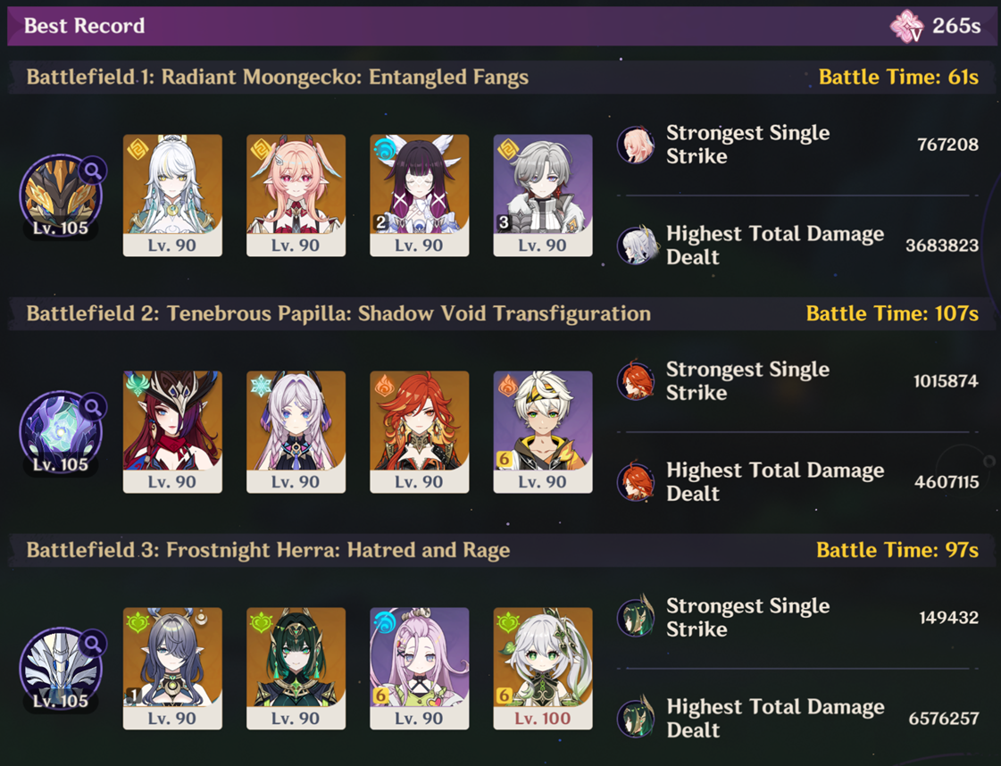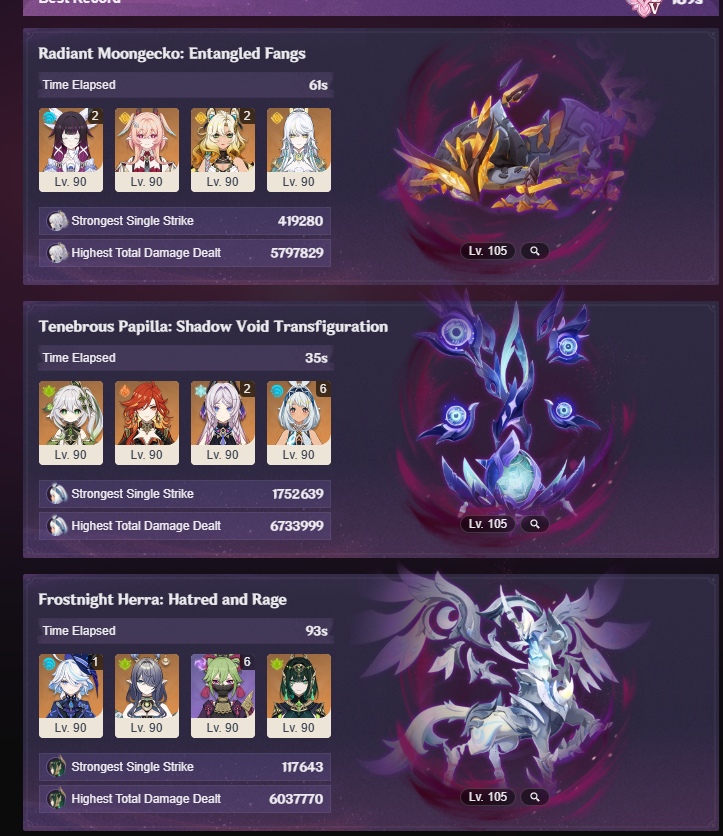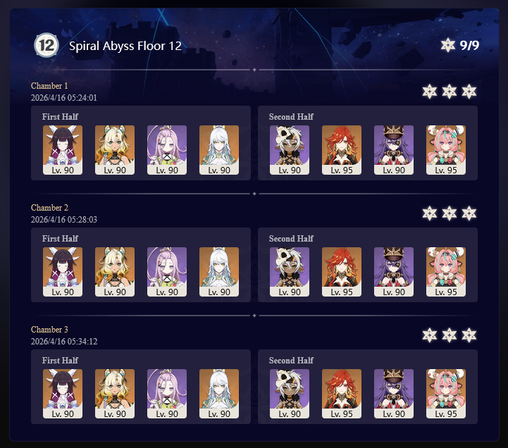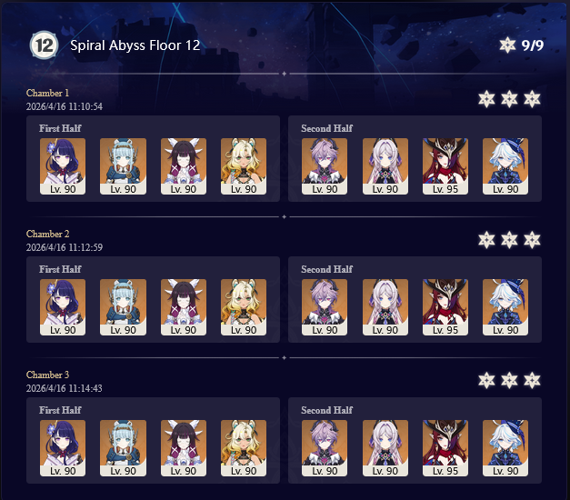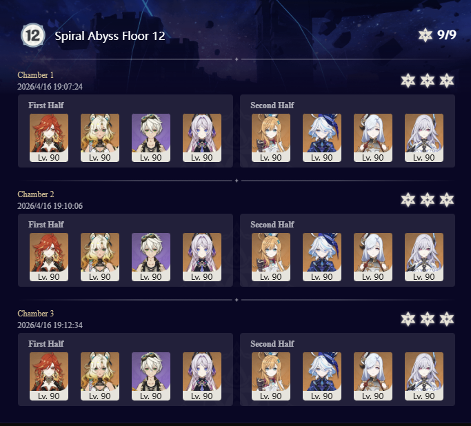 Here to collect your Stygian and Abyss Clears, bwosPost them when you're ready!--------->Too shy to post or just wanted to make sure I get your clear?>Can't solve captcha to post?Send them to me privately here:>Stygian Onslaught:https://www.jotform.com/253431076926459>Spiral Abyss:https://form.jotform.com/253493679126468--------->PREVIOUS ABYSS | PREVIOUS ABYSS | PREVIOUS ABYSS | PREVIOUS ABYSS | PREVIOUS ABYSS |Luna IV 2026-03-16 Spiral Abyss StatisticsSample size: 156 (4/gig/, 8/gig/, /gigvmg/ and /v/)Finalized: 2026-04-15Character Usage (List view):https://files.catbox.moe/dj2l6t.pngOther Statistics:https://files.catbox.moe/bvwt8t.png---------Congratulations to these anons for being:"4/gig/'s Top 10 SOVLFVL clears of Spiral Abyss 2026-03-16 Luna IV"#1. Clear #124 - >>/vg/560746428 - 971 points#2. Clear #18 - >>/vg/560526502 - 949 points#3. Clear #54 - >>/vg/560548597 - 934 points#4. Clear #98 - >>/vg/560619028 - 930 points#5. Clear #75 - >>/vg/560579708 - 927 points#6. Clear #101 - >>/vg/560633858 - 927 points#7. Clear #140 - >>/vg/560781170 - 886 points#8. Clear #35 - >>/vg/560532980 - 885 points#9. Clear #80 - >>/vg/560585029 - 878 points#10. Clear #102 - >>/vg/560635295 - 873 pointsLeaderboard (4/gig/ on /vg/): https://files.catbox.moe/cgb8lq.pngLeaderboard (8/gig/ on /gacha/): https://files.catbox.moe/wj2teu.png---------How is the ranking tabulated?Every submissions get 1000 points as default grade,then the grade will be reduced based on voting data of this poll(Vote if you haven't/ Change your vote:https://strawpoll.com/B2ZB9wmqAgJ) (Linnea Option added)Submissions with similar grade will then be ranked by the order of submission time(earlier submission gets higher rank)