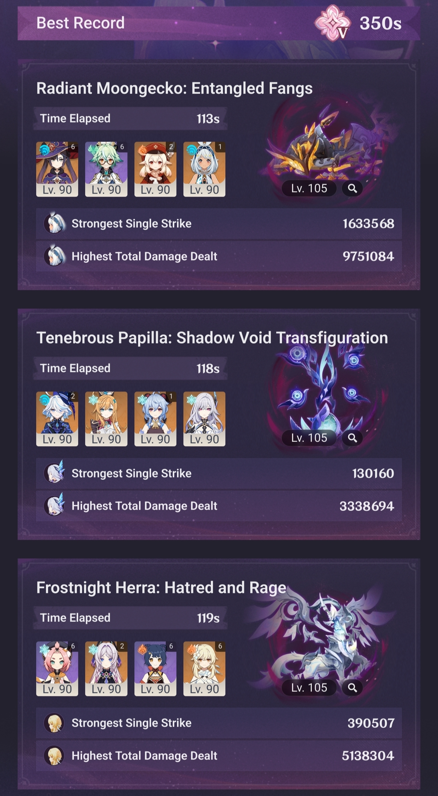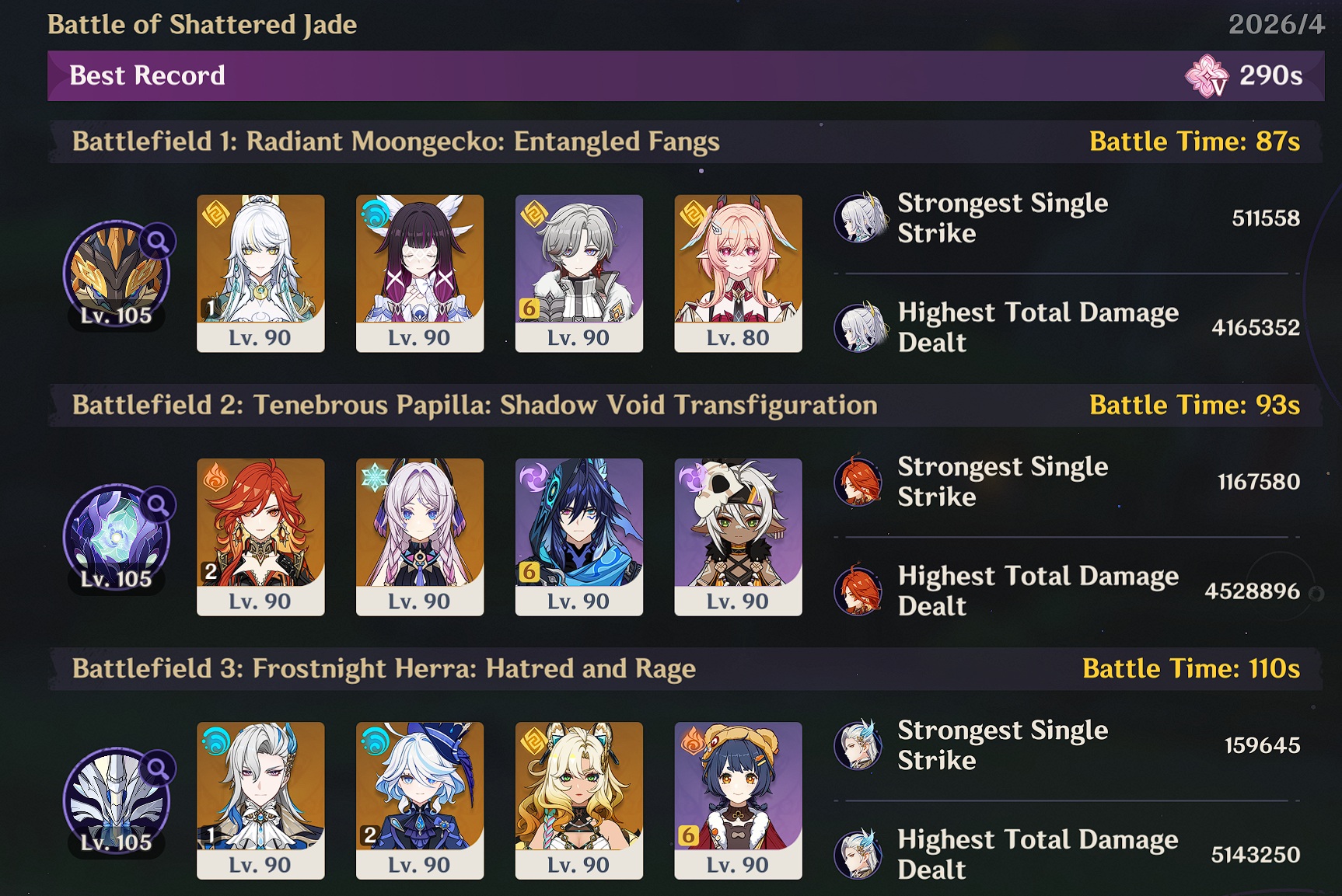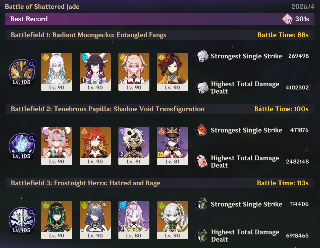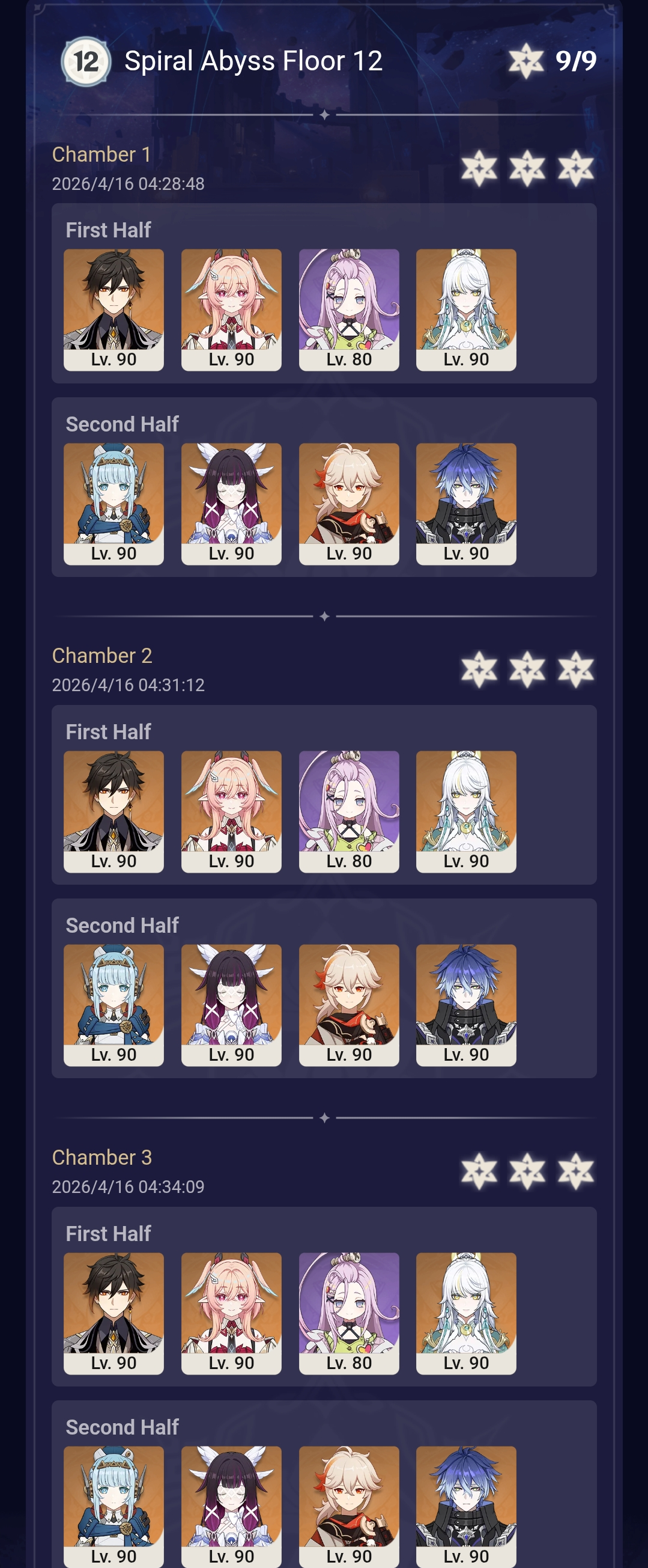 Here to collect your Stygian and Abyss Clears, bwosPost them when you're ready!--------->Too shy to post or just wanted to make sure I get your clear?>Can't solve captcha to post?Send them to me privately here:>Stygian Onslaught:https://www.jotform.com/253431076926459>Spiral Abyss:https://form.jotform.com/253493679126468--------->PREVIOUS ABYSS | PREVIOUS ABYSS | PREVIOUS ABYSS | PREVIOUS ABYSS | PREVIOUS ABYSS |Luna IV 2026-03-16 Spiral Abyss StatisticsSample size: 156 (4/gig/, 8/gig/, /gigvmg/ and /v/)Finalized: 2026-04-15Character Usage (List view):https://files.catbox.moe/dj2l6t.pngOther Statistics:https://files.catbox.moe/bvwt8t.png---------Congratulations to these anons for being:"4/gig/'s Top 10 SOVLFVL clears of Spiral Abyss 2026-03-16 Luna IV"#1. Clear #124 - >>/vg/560746428 - 971 points#2. Clear #18 - >>/vg/560526502 - 949 points#3. Clear #54 - >>/vg/560548597 - 934 points#4. Clear #98 - >>/vg/560619028 - 930 points#5. Clear #75 - >>/vg/560579708 - 927 points#6. Clear #101 - >>/vg/560633858 - 927 points#7. Clear #140 - >>/vg/560781170 - 886 points#8. Clear #35 - >>/vg/560532980 - 885 points#9. Clear #80 - >>/vg/560585029 - 878 points#10. Clear #102 - >>/vg/560635295 - 873 pointsLeaderboard (4/gig/ on /vg/): https://files.catbox.moe/cgb8lq.pngLeaderboard (8/gig/ on /gacha/): https://files.catbox.moe/wj2teu.png---------How is the ranking tabulated?Every submissions get 1000 points as default grade,then the grade will be reduced based on voting data of this poll(Vote if you haven't/ Change your vote:https://strawpoll.com/B2ZB9wmqAgJ) (Linnea Option added)Submissions with similar grade will then be ranked by the order of submission time(earlier submission gets higher rank)