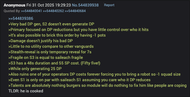 >>563735870Alright not reading the whole thread but ctrl+f'ing SIlverash let's see>Why would you bring a vanguard if it wasn't for DP or utility (silverash lacks both of these)>Silverash LOST>>chinks were right about Silverash Alt>So you mean to tell me… they made *THE* Silverash… mediocre? When Eyja got a broken alt? When Exusiai got a broken alt? What the fuck?????????>He's dead bro.. his module ain't fixing this>silverash gotten so fat he can't pull his weight anymore...>Silverash... how have you let yourself go...>This is all a part of Silverash's master plan>I'll be honest, I wouldn't use Silverash for Vec 12 if we had him right now.>now apply it to DP/utility of other vanguards and you'll see how bad silverash is vs them. even his fragile is equal to saileach's. his only redeeming factor is the DP swap, are you really bringing him+a robot or filler character just to DP swap?>>NGA memeing how silverash's S1 giving 1000 HP shields will make him top 15 op in the game!>silverash stocks are plummeting..>SilverAsh is now jobless...Wow it's literally all negative besides the master plan comment