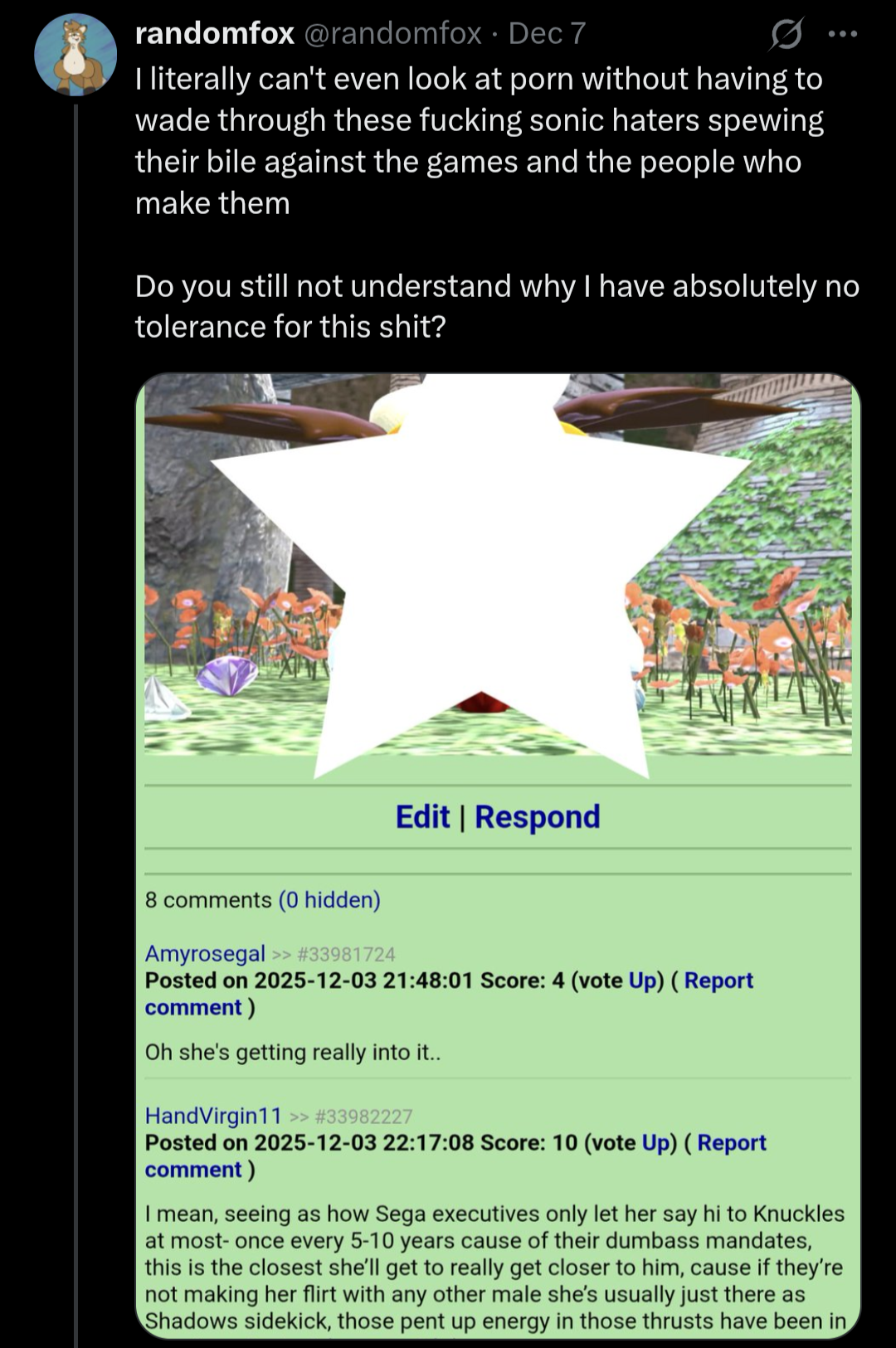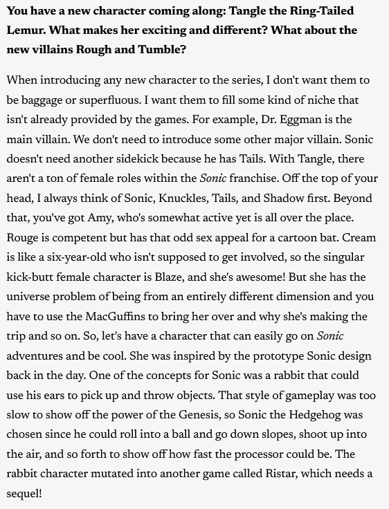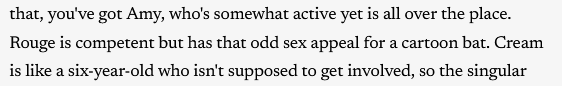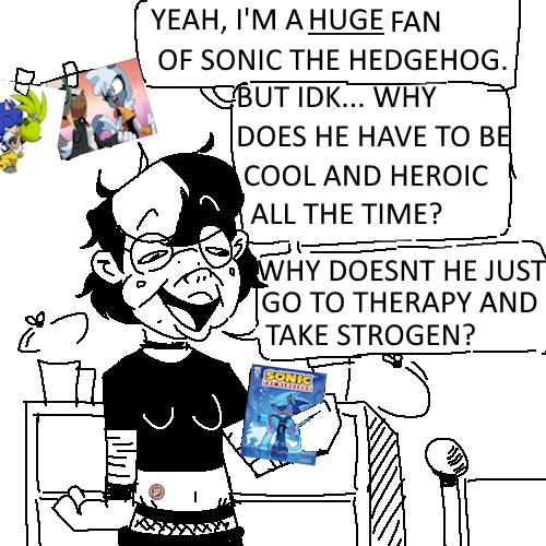>sonic would be better if he slowed down and showed his emotions more and cried and was more vulnerable>silver would be better if he was a sweet socially awkward soft boy >shadow would be better if he smiled more and told all of his friends that he loved them >tails would be better if he was a platinum gigachad who fucked a hundred women>amy would be better if she stopped loving sonicYeah I'm thinking Comic fans hate the characters