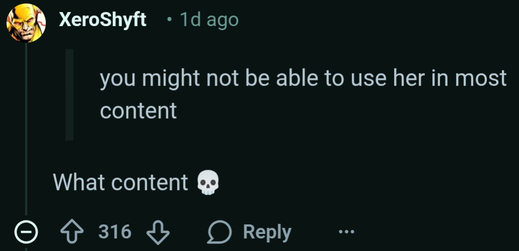 >>563755786>i don't care about im not pulling with her the design was ugly from the start with those pants that look like it came from the closet of some bitch developer.