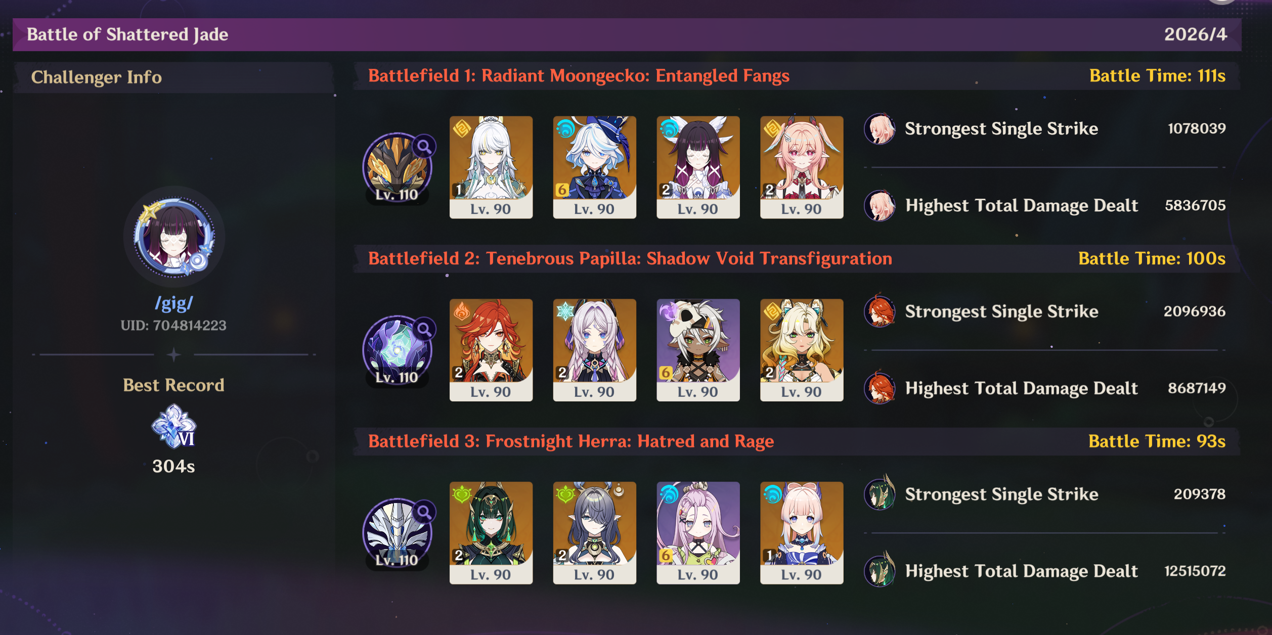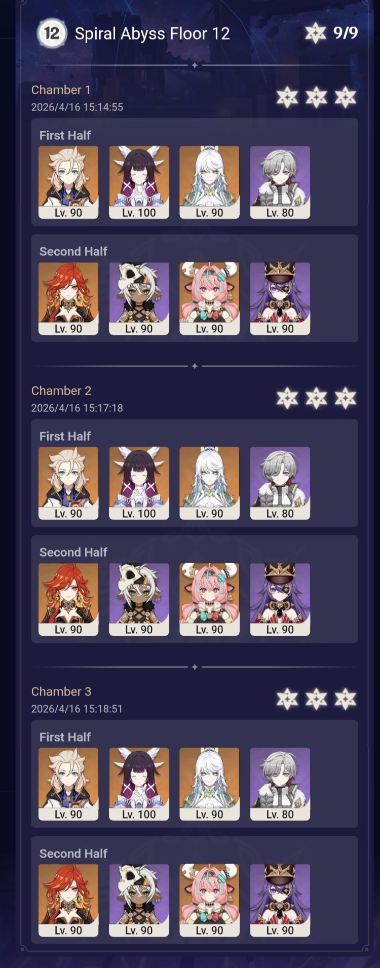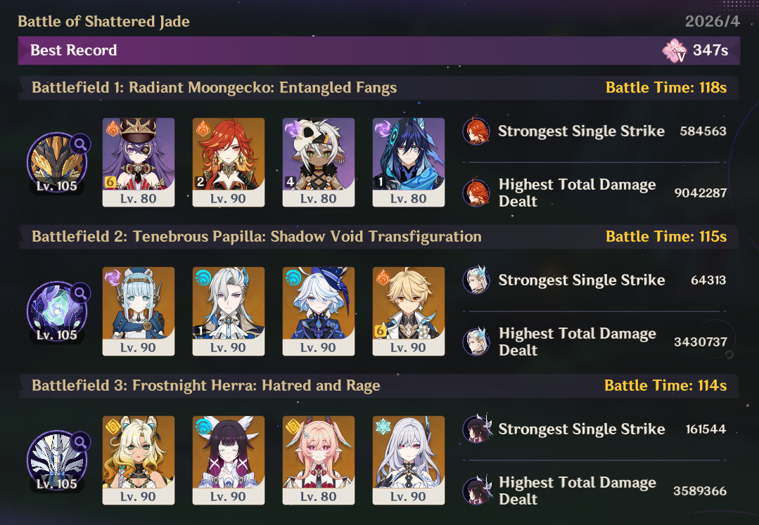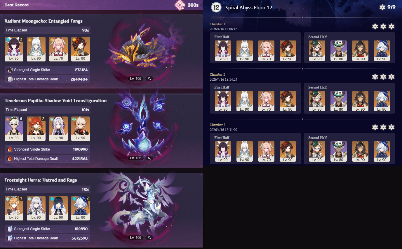 Here to collect your Stygian and Abyss Clears, bwosPost them when you're ready!--------->Too shy to post or just wanted to make sure I get your clear?>Can't solve captcha to post?Send them to me privately here:>Stygian Onslaught:https://www.jotform.com/253431076926459>Spiral Abyss:https://form.jotform.com/253493679126468--------->PREVIOUS ABYSS | PREVIOUS ABYSS | PREVIOUS ABYSS | PREVIOUS ABYSS | PREVIOUS ABYSS |Luna IV 2026-03-16 Spiral Abyss StatisticsSample size: 156 (4/gig/, 8/gig/, /gigvmg/ and /v/)Finalized: 2026-04-15Character Usage (List view):https://files.catbox.moe/dj2l6t.pngOther Statistics:https://files.catbox.moe/bvwt8t.png---------Congratulations to these anons for being:"4/gig/'s Top 10 SOVLFVL clears of Spiral Abyss 2026-03-16 Luna IV"#1. Clear #124 - >>/vg/560746428 - 971 points#2. Clear #18 - >>/vg/560526502 - 949 points#3. Clear #54 - >>/vg/560548597 - 934 points#4. Clear #98 - >>/vg/560619028 - 930 points#5. Clear #75 - >>/vg/560579708 - 927 points#6. Clear #101 - >>/vg/560633858 - 927 points#7. Clear #140 - >>/vg/560781170 - 886 points#8. Clear #35 - >>/vg/560532980 - 885 points#9. Clear #80 - >>/vg/560585029 - 878 points#10. Clear #102 - >>/vg/560635295 - 873 pointsLeaderboard (4/gig/ on /vg/): https://files.catbox.moe/cgb8lq.pngLeaderboard (8/gig/ on /gacha/): https://files.catbox.moe/wj2teu.png---------How is the ranking tabulated?Every submissions get 1000 points as default grade,then the grade will be reduced based on voting data of this poll(Vote if you haven't/ Change your vote:https://strawpoll.com/B2ZB9wmqAgJ) (Linnea Option added)Submissions with similar grade will then be ranked by the order of submission time(earlier submission gets higher rank)