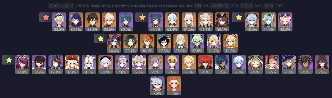 >>563747495Abyss usage stats were always a showcase of shilling and popularity. But nowadays it's purely shilling showcase, it seems people don't even both to use their favourite characters.